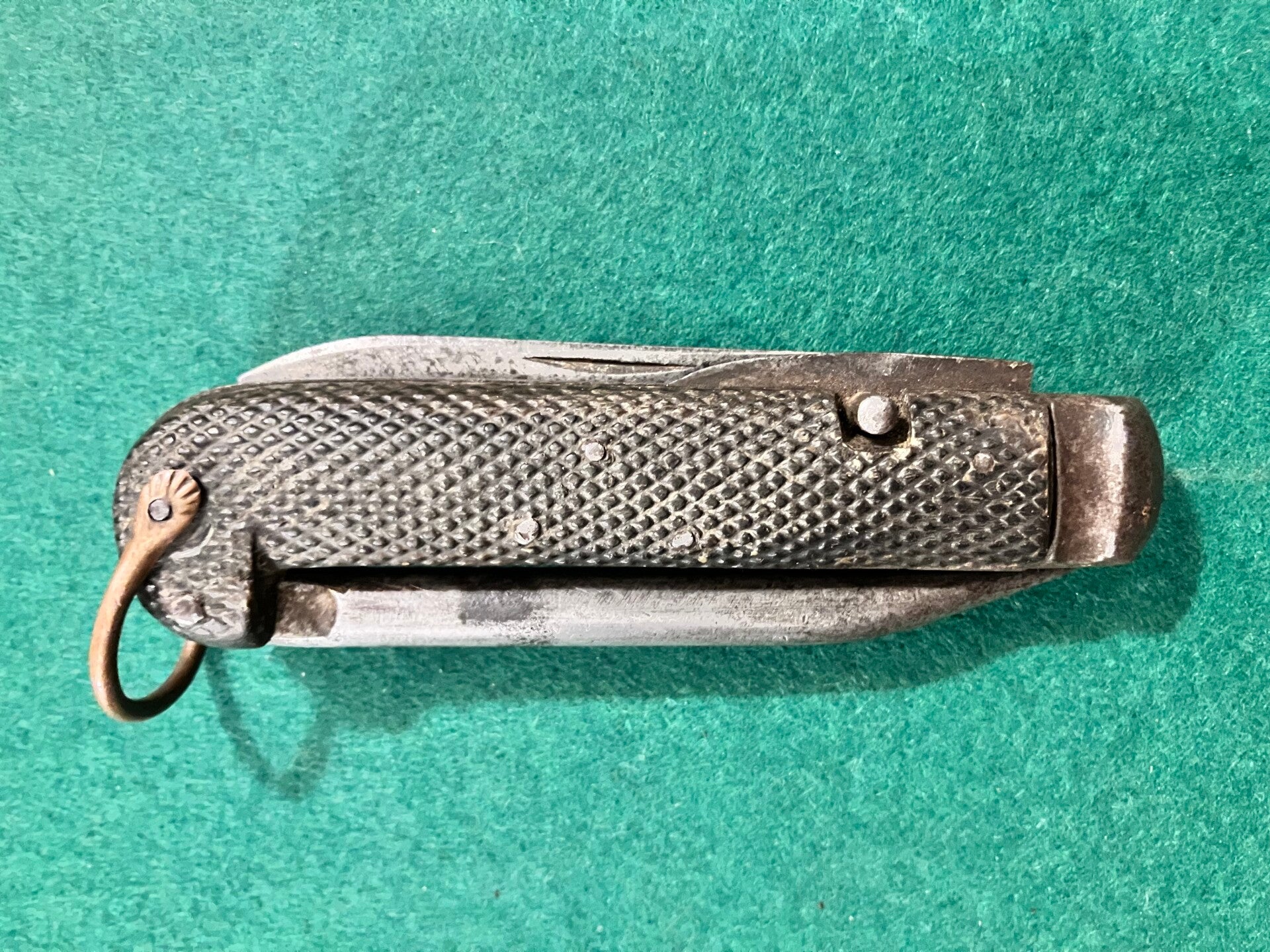 Undated 6353 pattern by Sheffield Steel Products. Some wear to blade as shown but other than a small loss of horn on one scale overall condition is quite good. Marline spike is stamped ' W /|\ D 6' Blade length approx 92mm.
