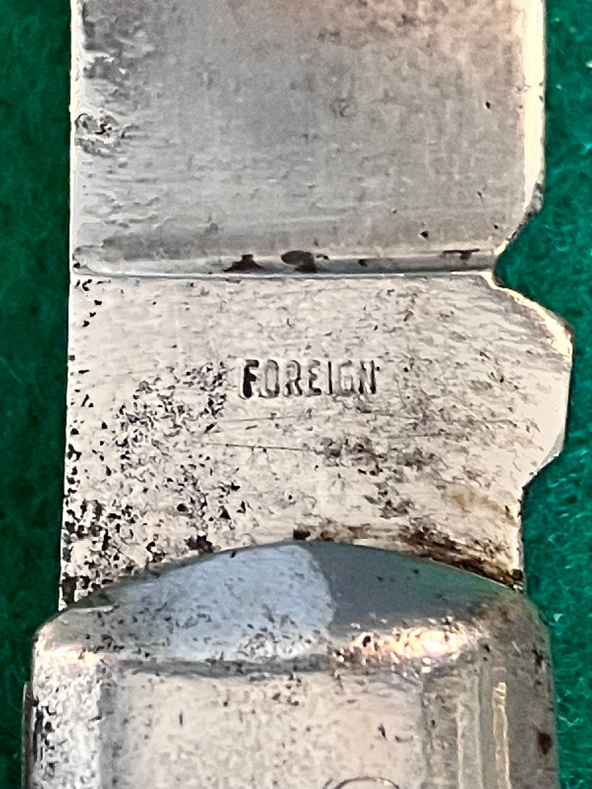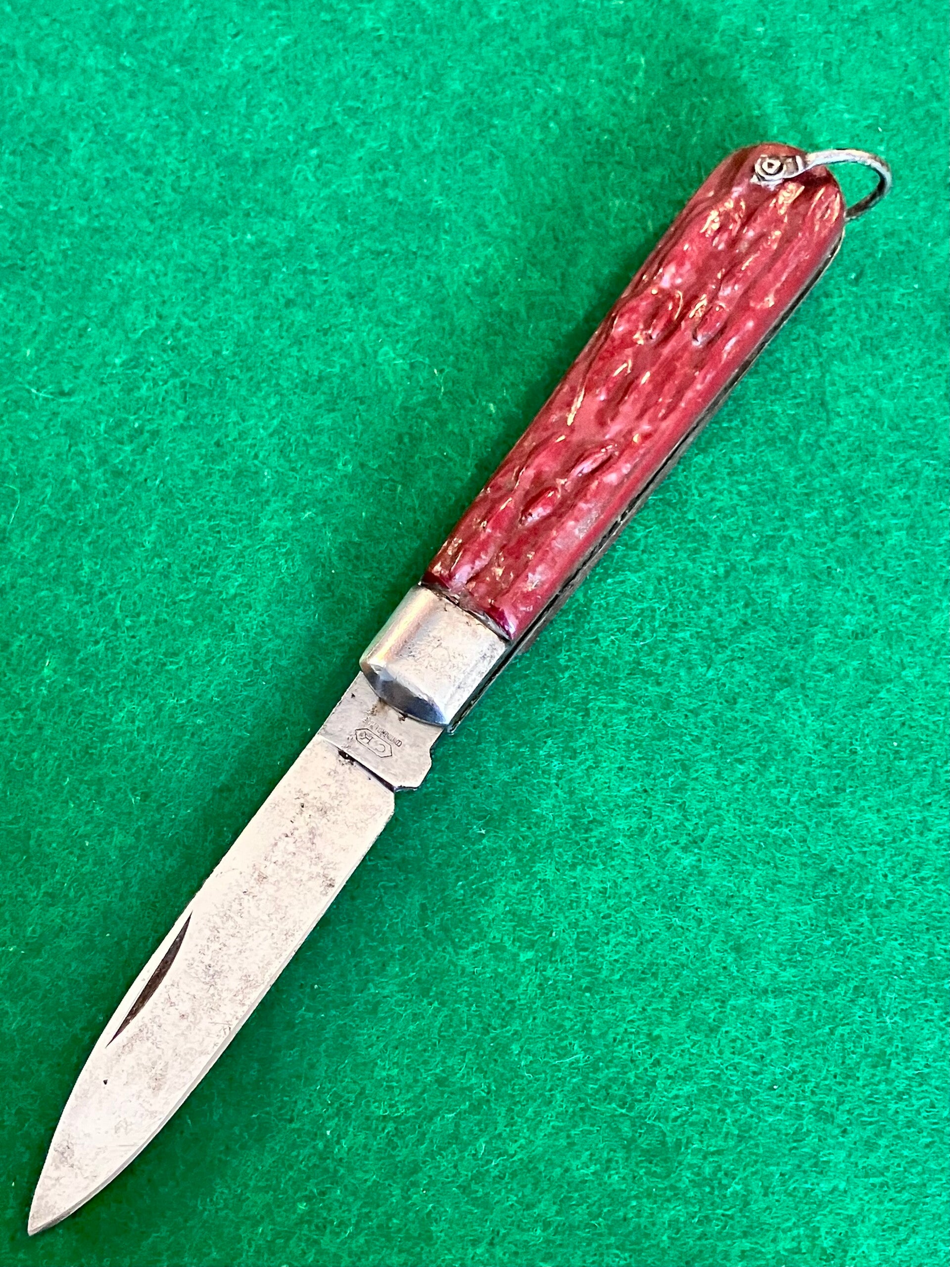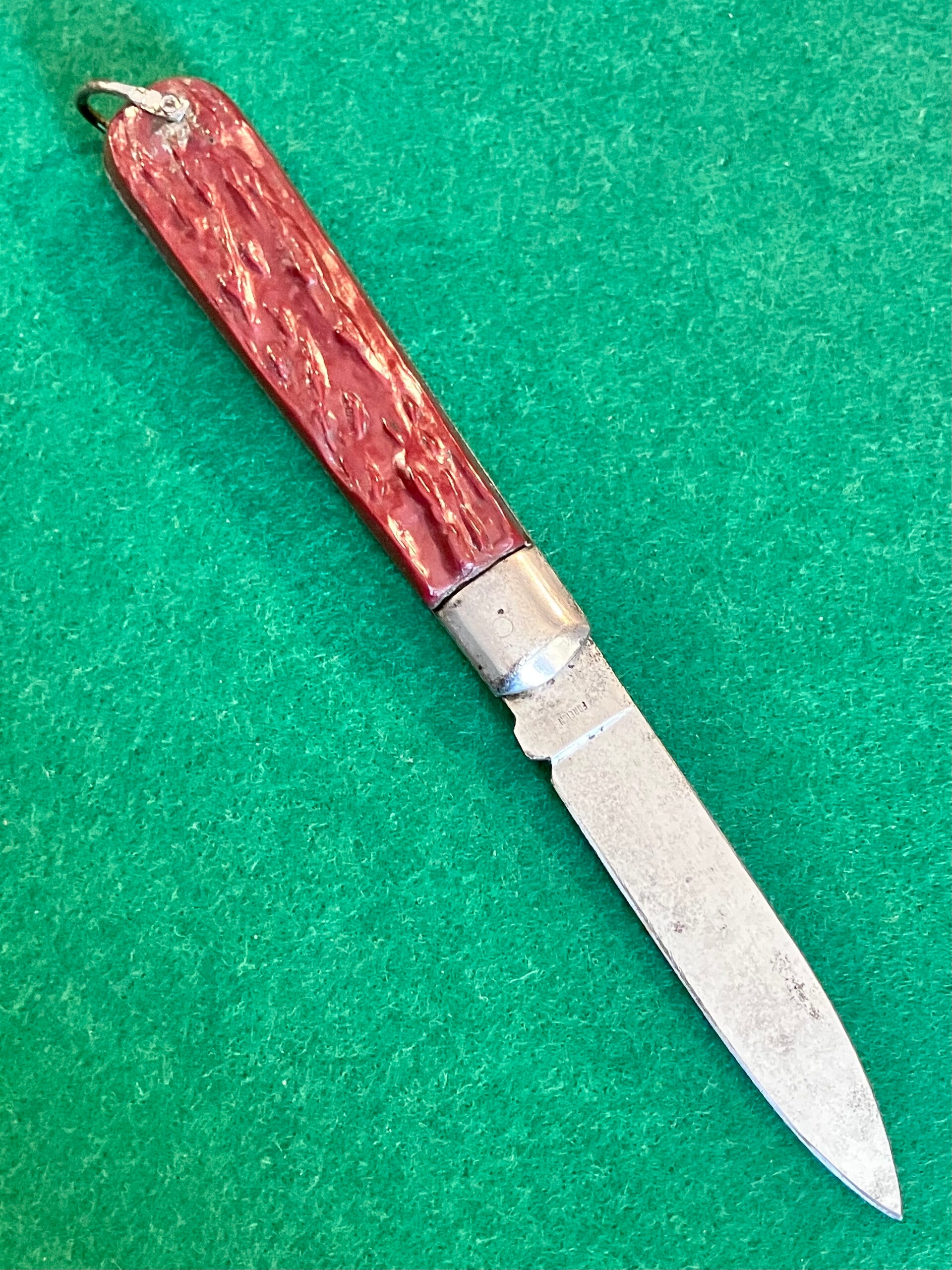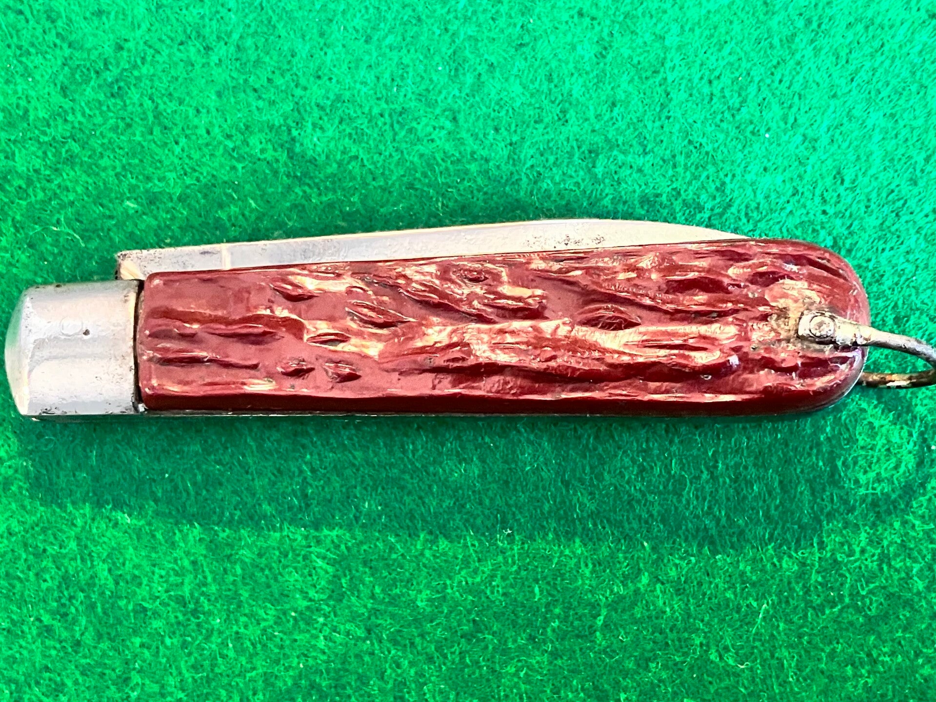 Italian made CK, carbon steel blade & bolsters with imitation stag in a maroon sort of colour. Some light pitting/blemishes to blade, excellent snap & no play. Will make a great working knife. Blade length approx 82mm.