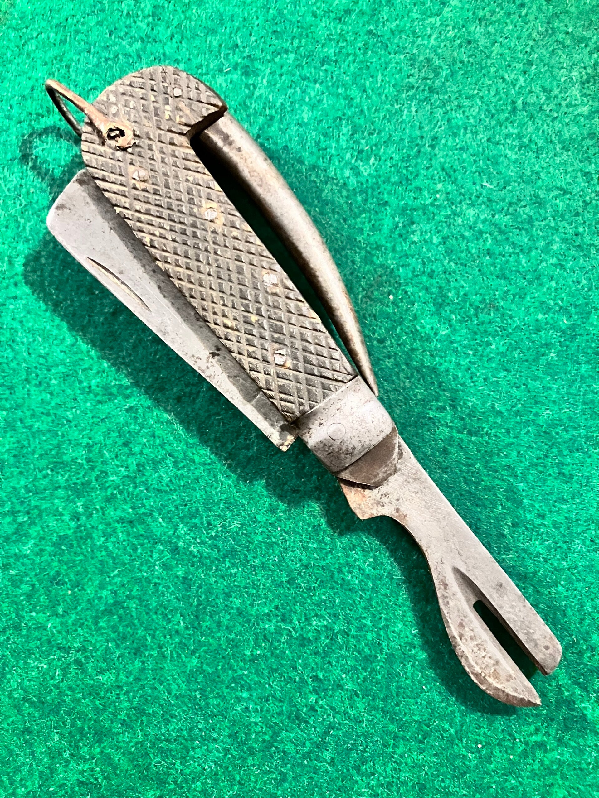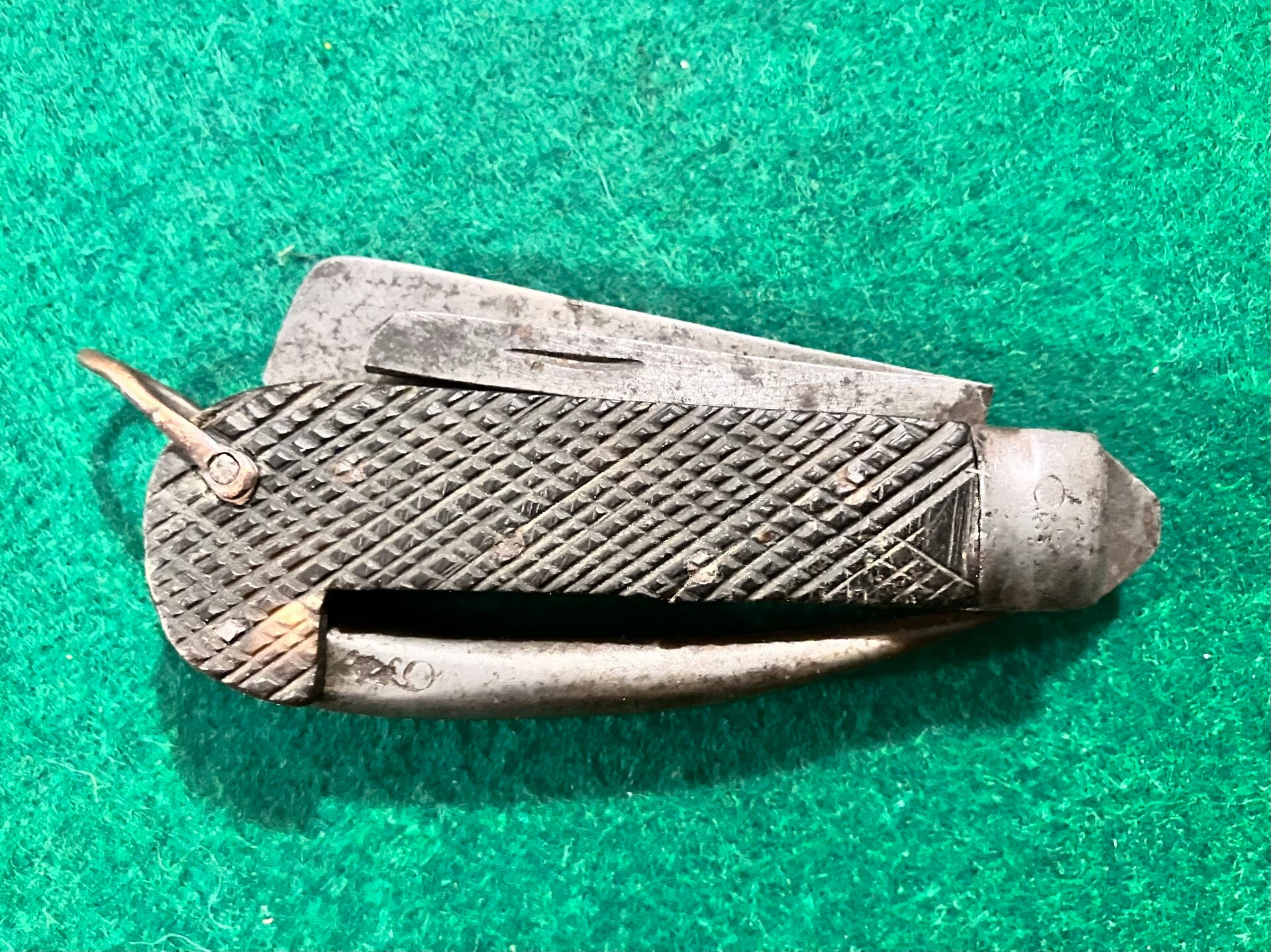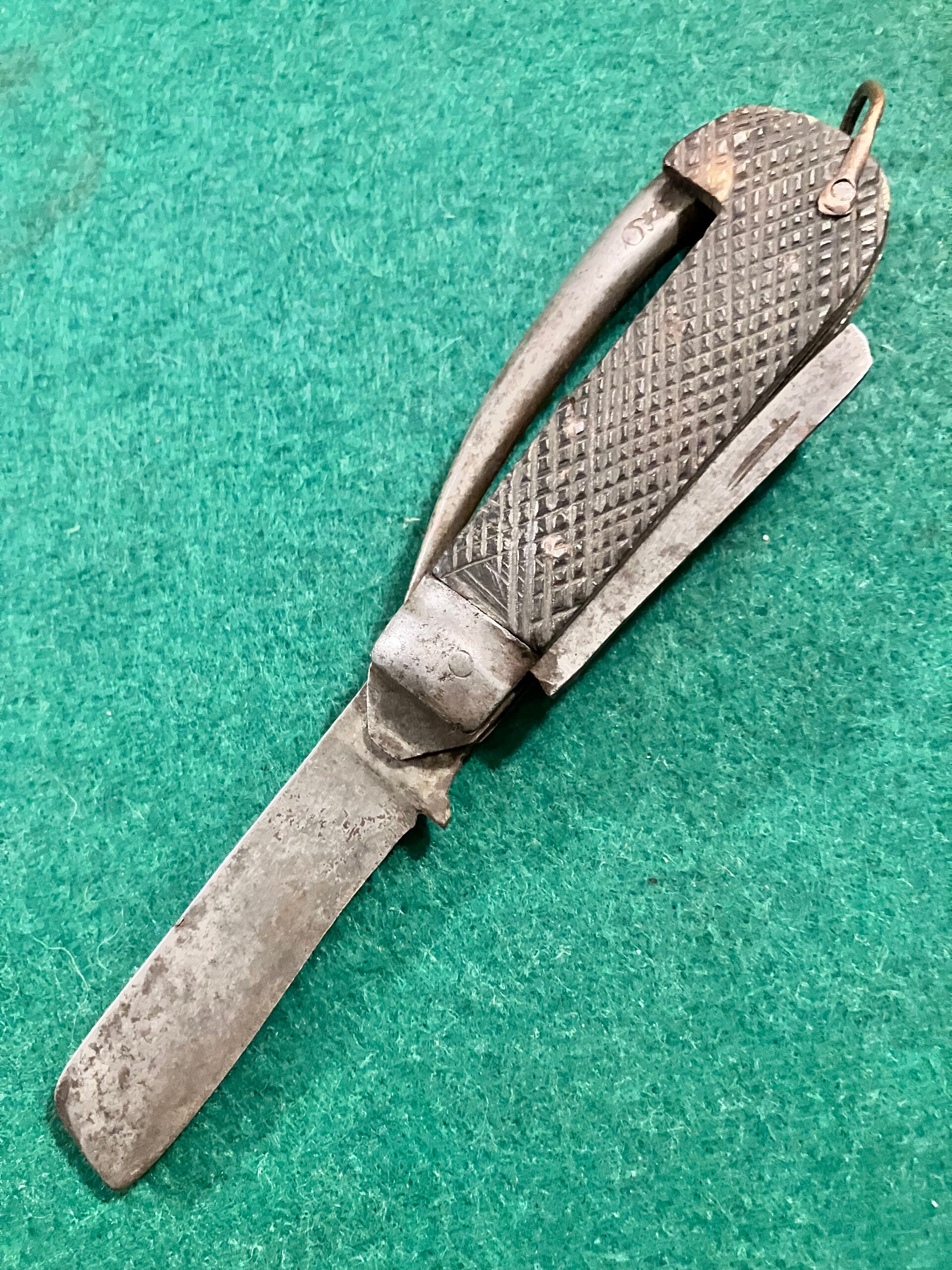 No visible makers marks, only '6' on the marline spike. Horn scales, very good snap and no play. Damage to shackle as shown. Blade length approx 72mm. PHOTO ID REQUIRED BEFORE POSTING