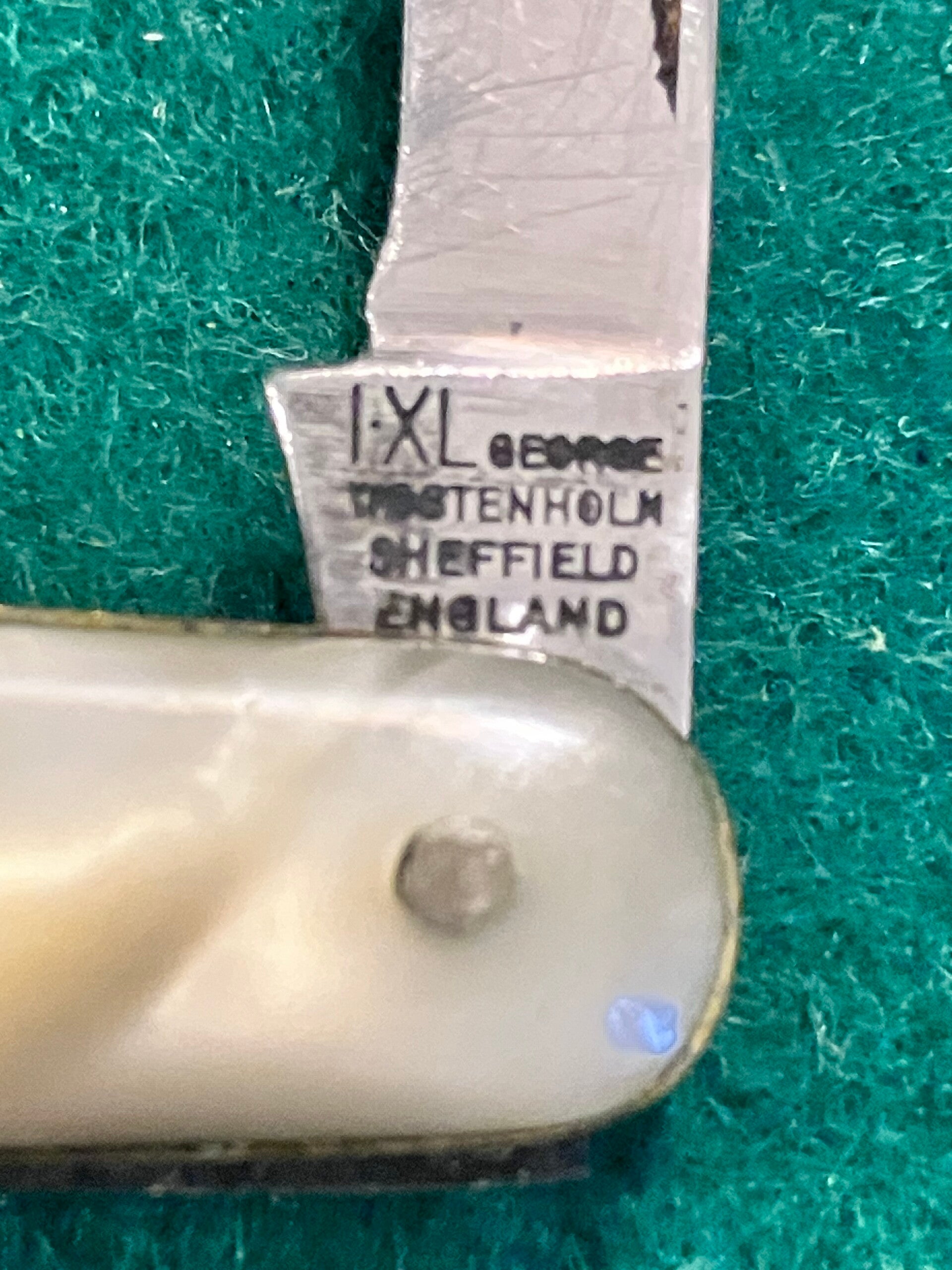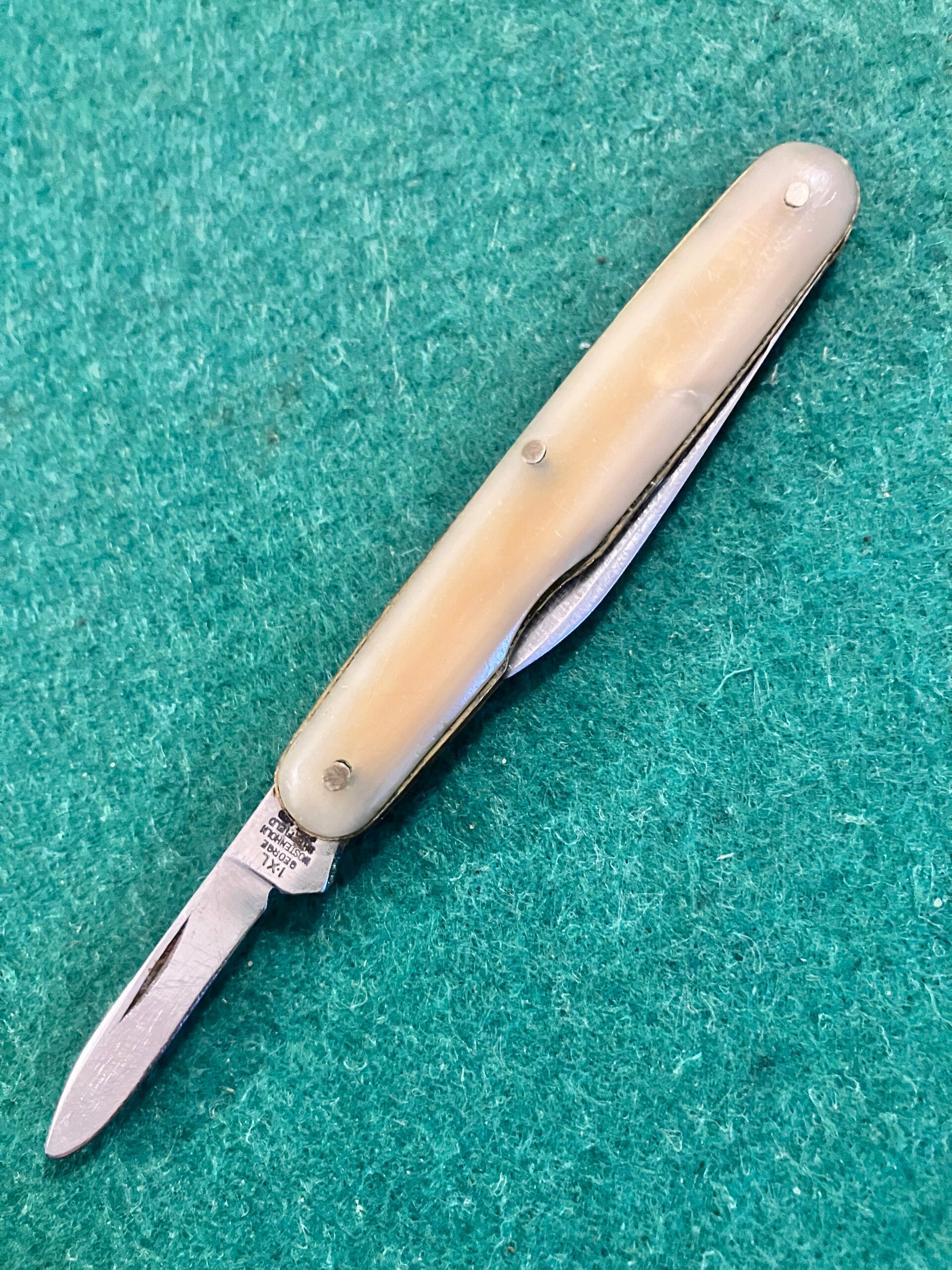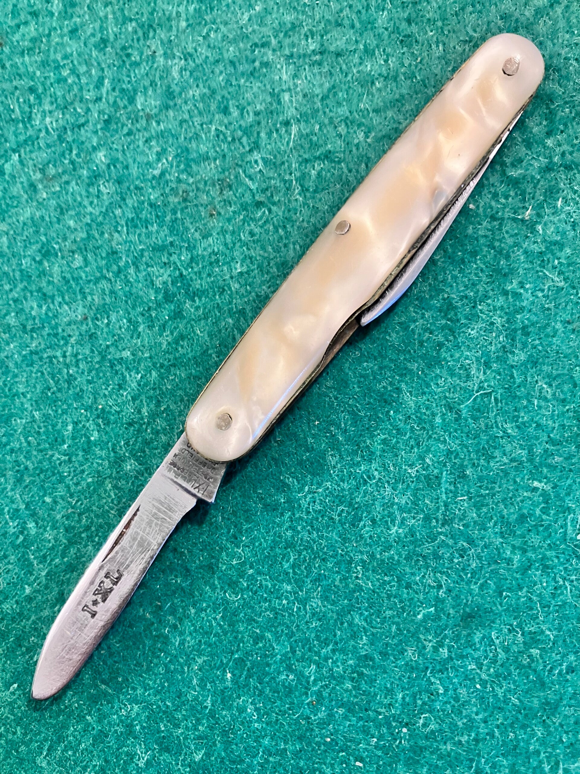 Well used 1960's I*XL penknife with simulated mother of pearl scales. Obvious signs of sharpening and a little shrinkage to scales. Both blades have good snap, no play to secondary blade but a little sideways movenent in the main blade.