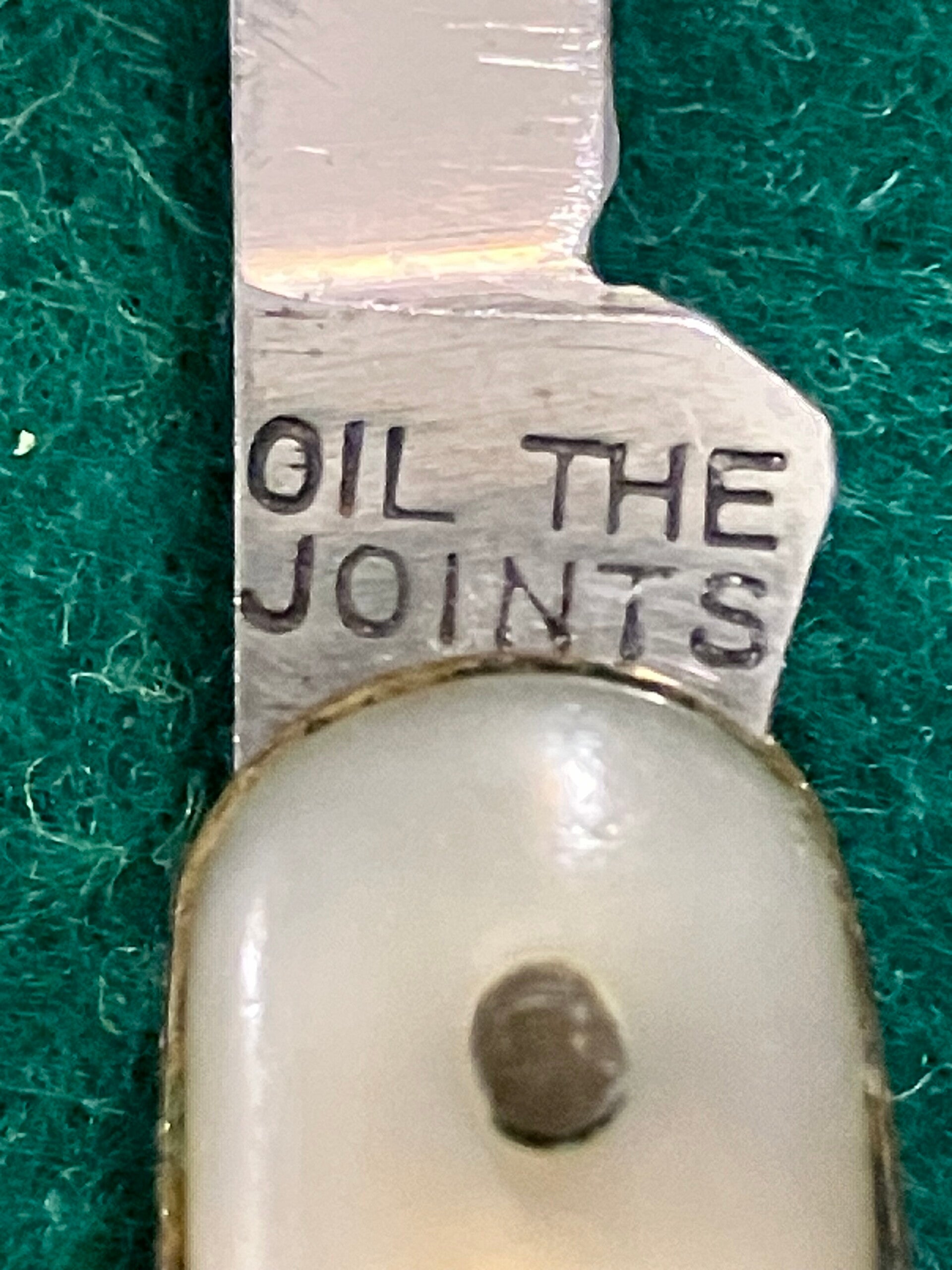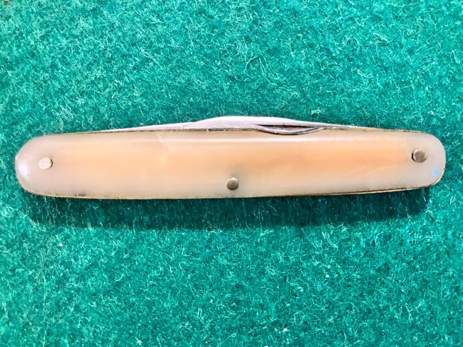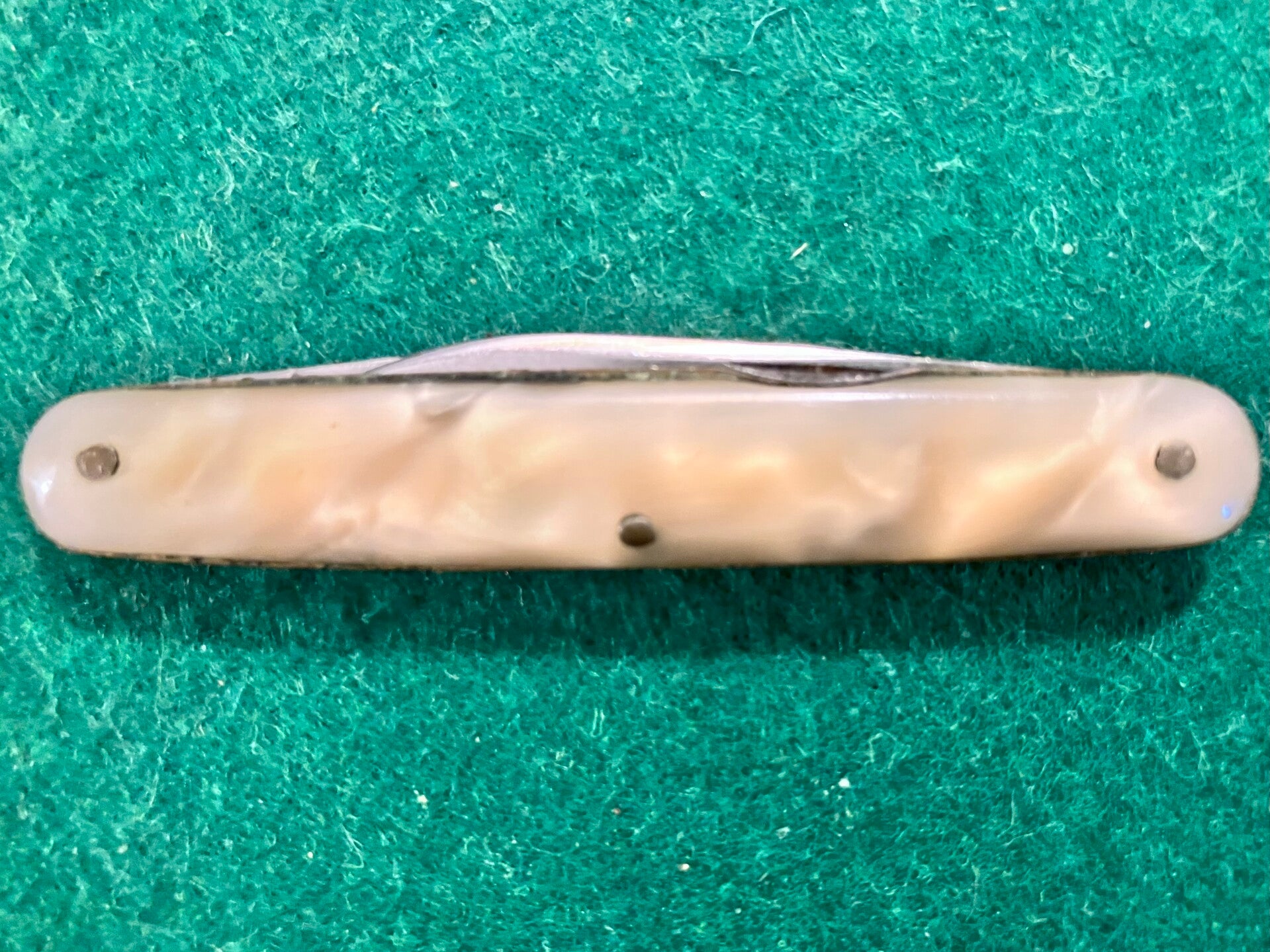 Well used 1960's I*XL penknife with simulated mother of pearl scales. Obvious signs of sharpening and a little shrinkage to scales. Both blades have good snap, no play to secondary blade but a little sideways movenent in the main blade.