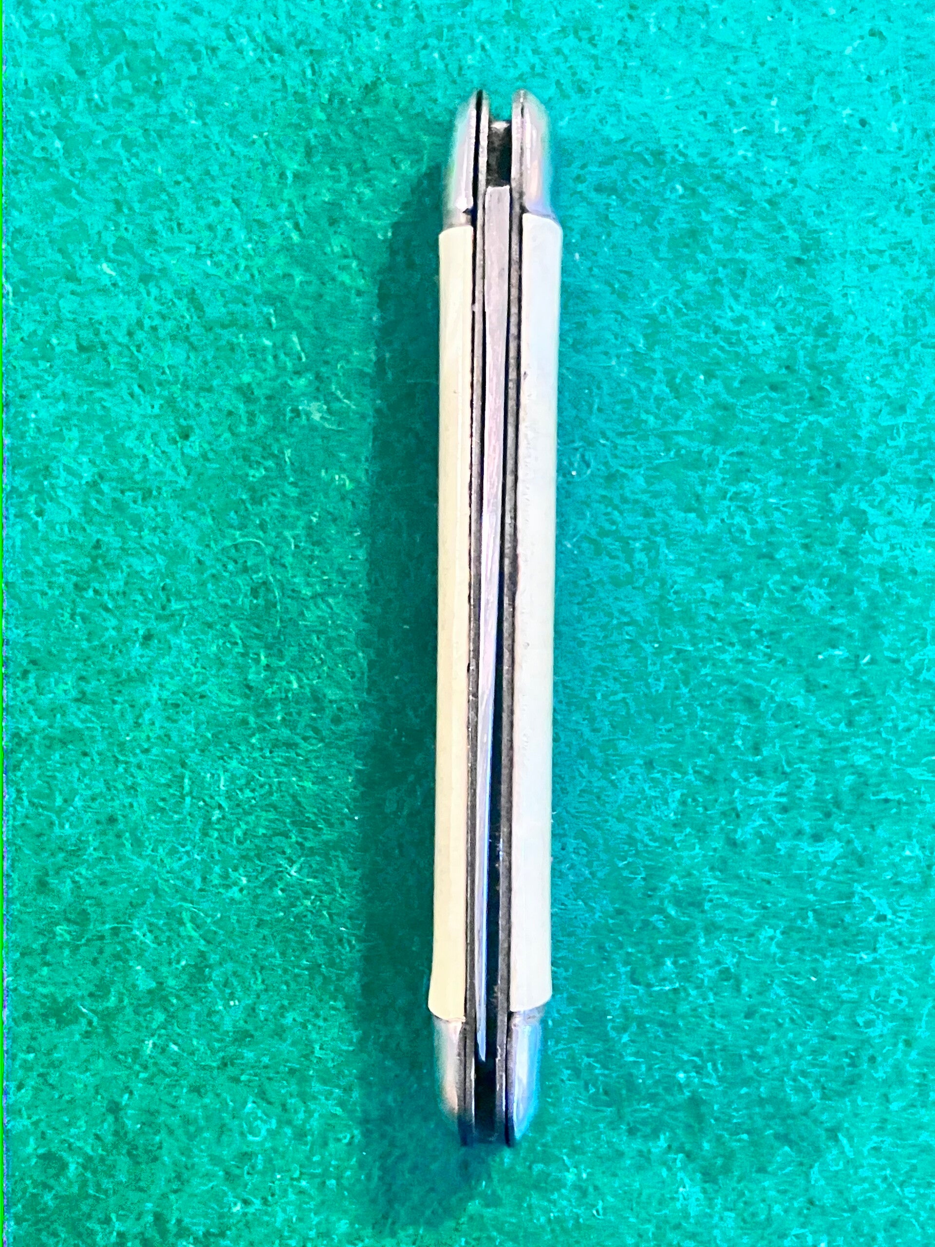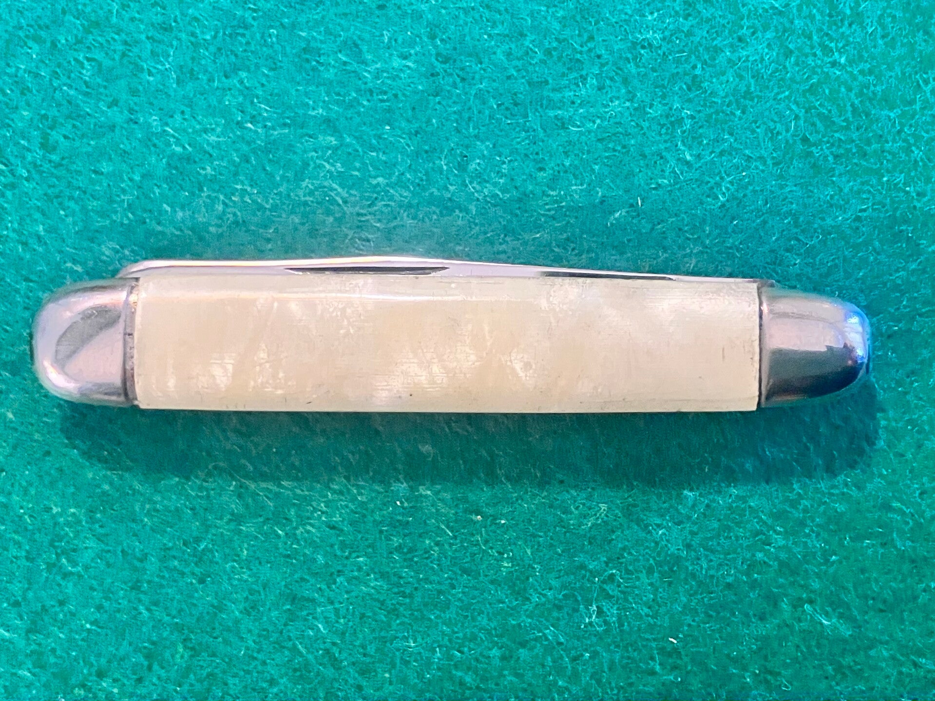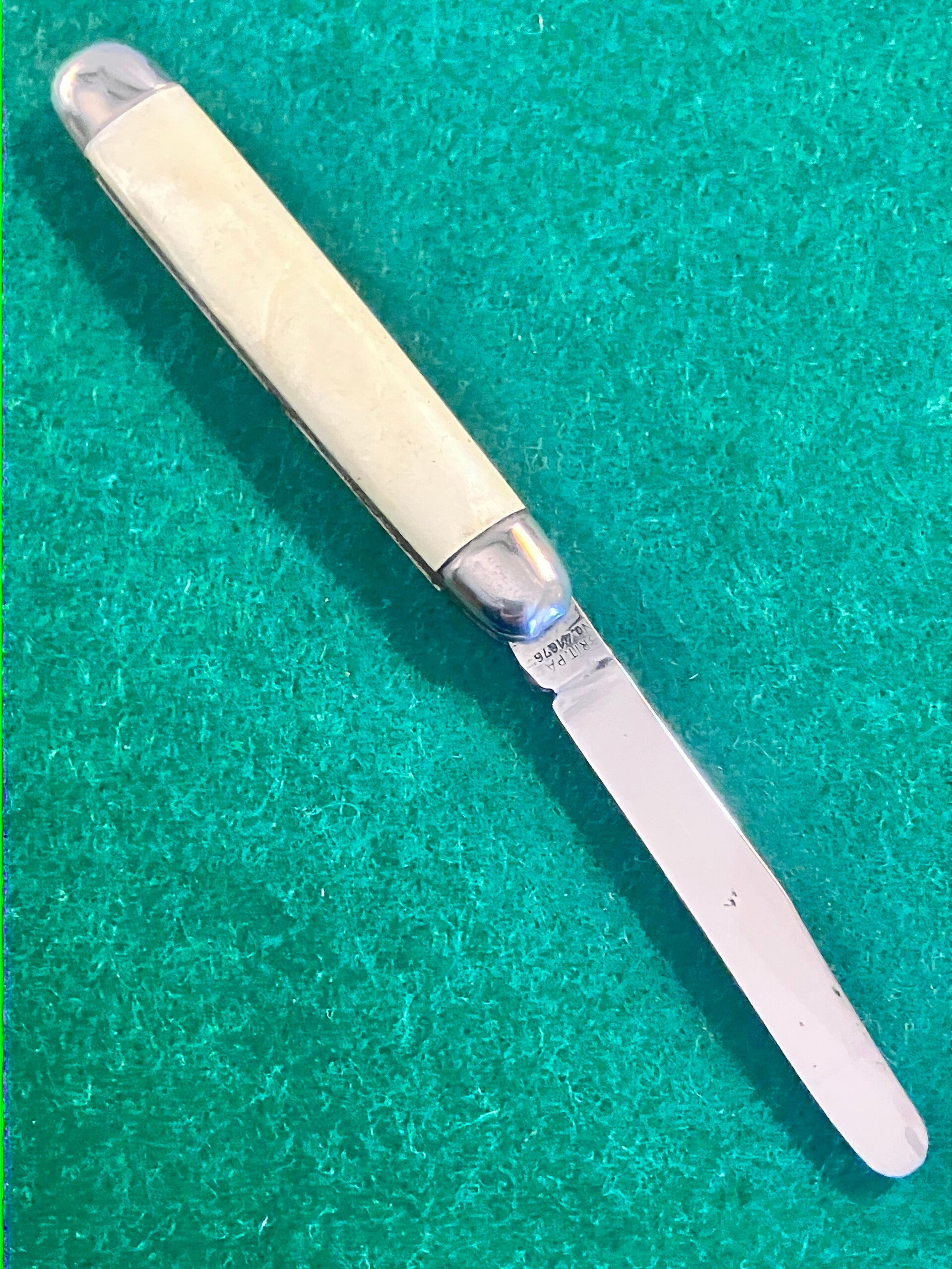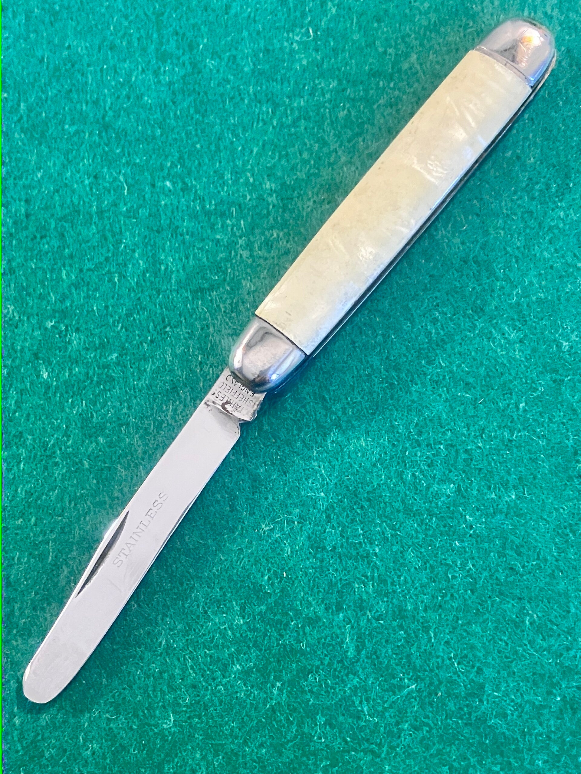 1970's vintage round ended knife with stainless blade. Scales are clip on type. Very good condition, great snap and no play. Blade length approx 59mm. PHOTO ID REQUIRED BEFORE POSTING