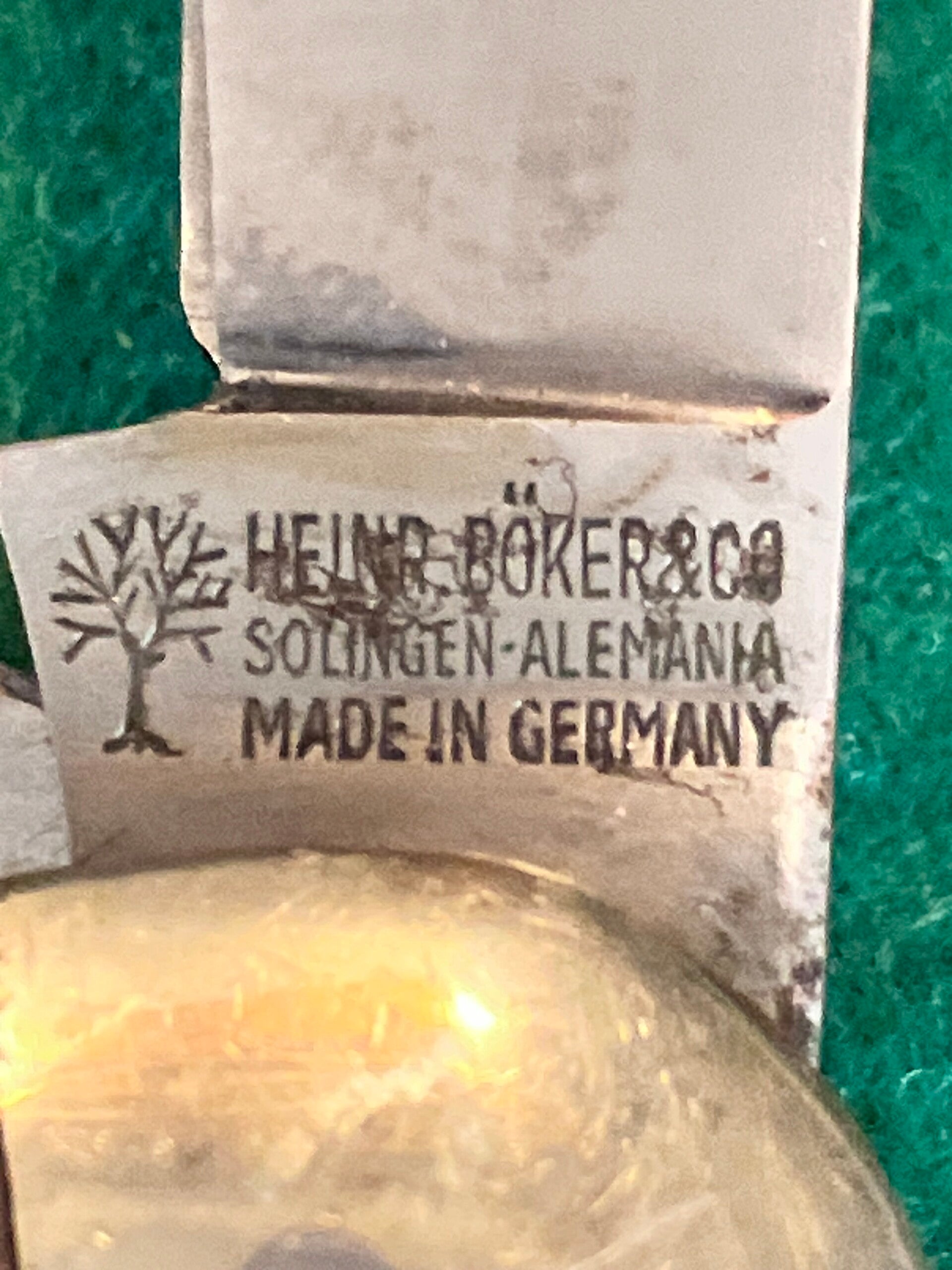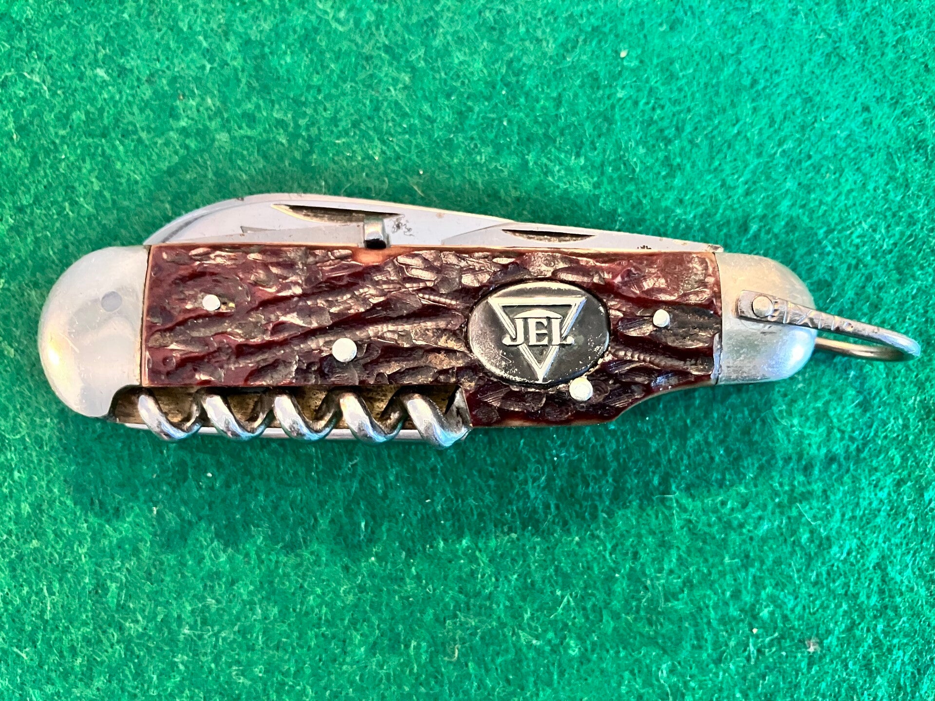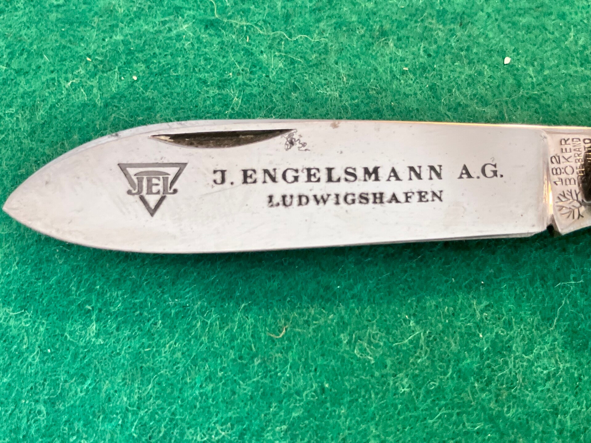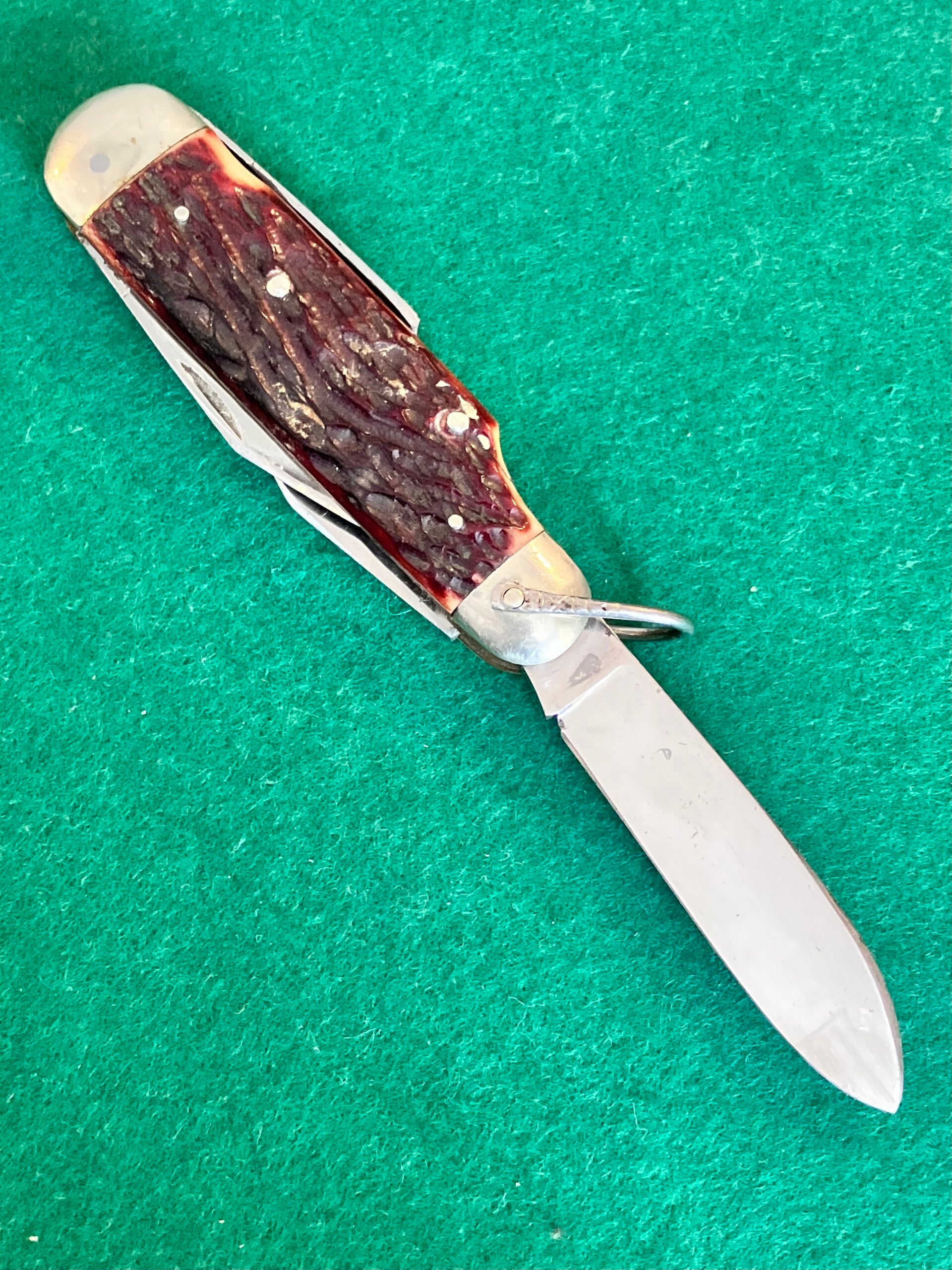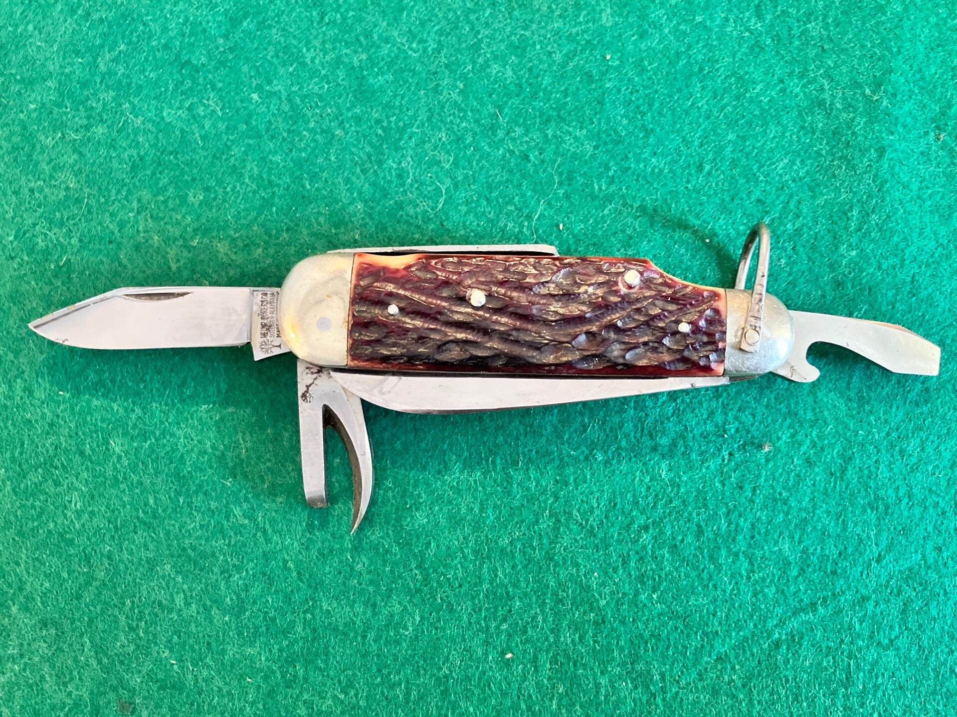 1930's Böker camp knife for J Engelsmann, slight blemishes here and there and one small crack to one bone scale but otherwise in extremely good condition. Good snap to all tools and no play. Blades are all carbon steel. Has the wedge shaped central divider and patterned shackle indicative of a 1930's Böker made in Solingen. Blade length approx 66mm.
