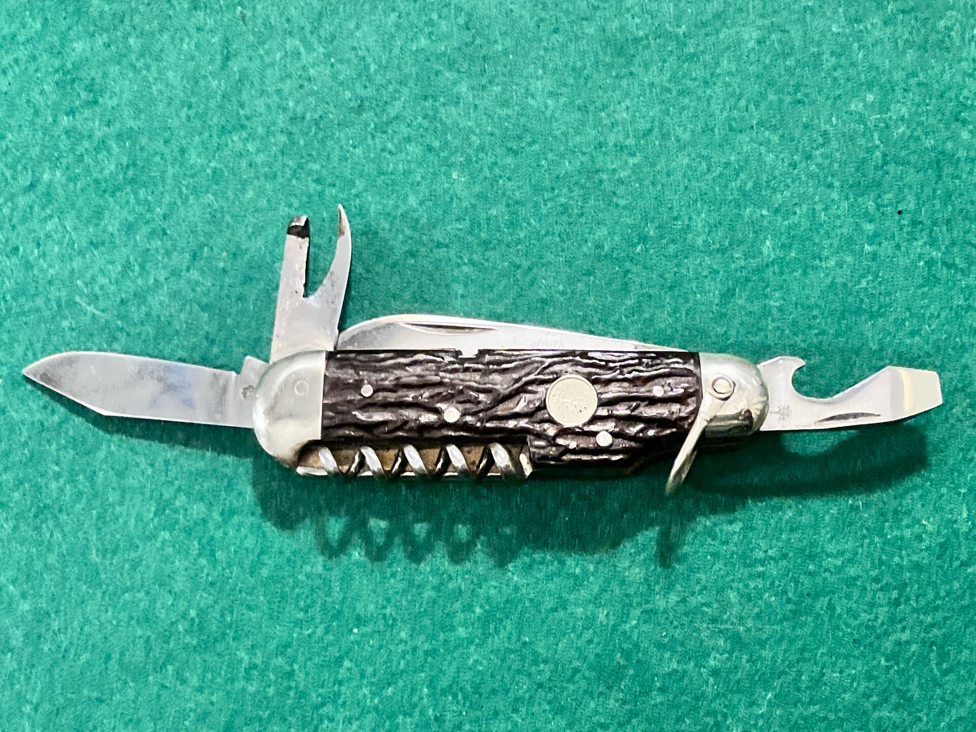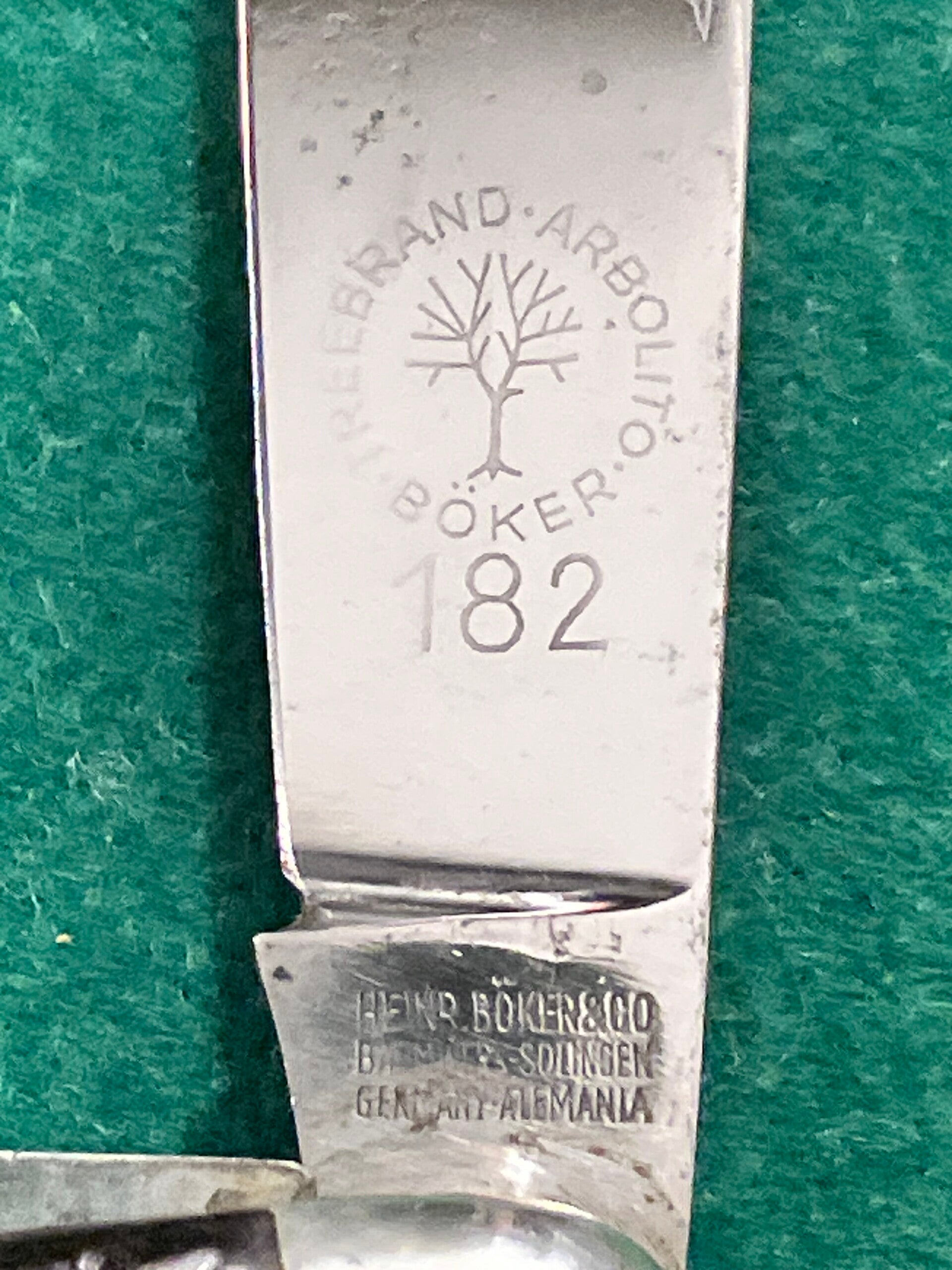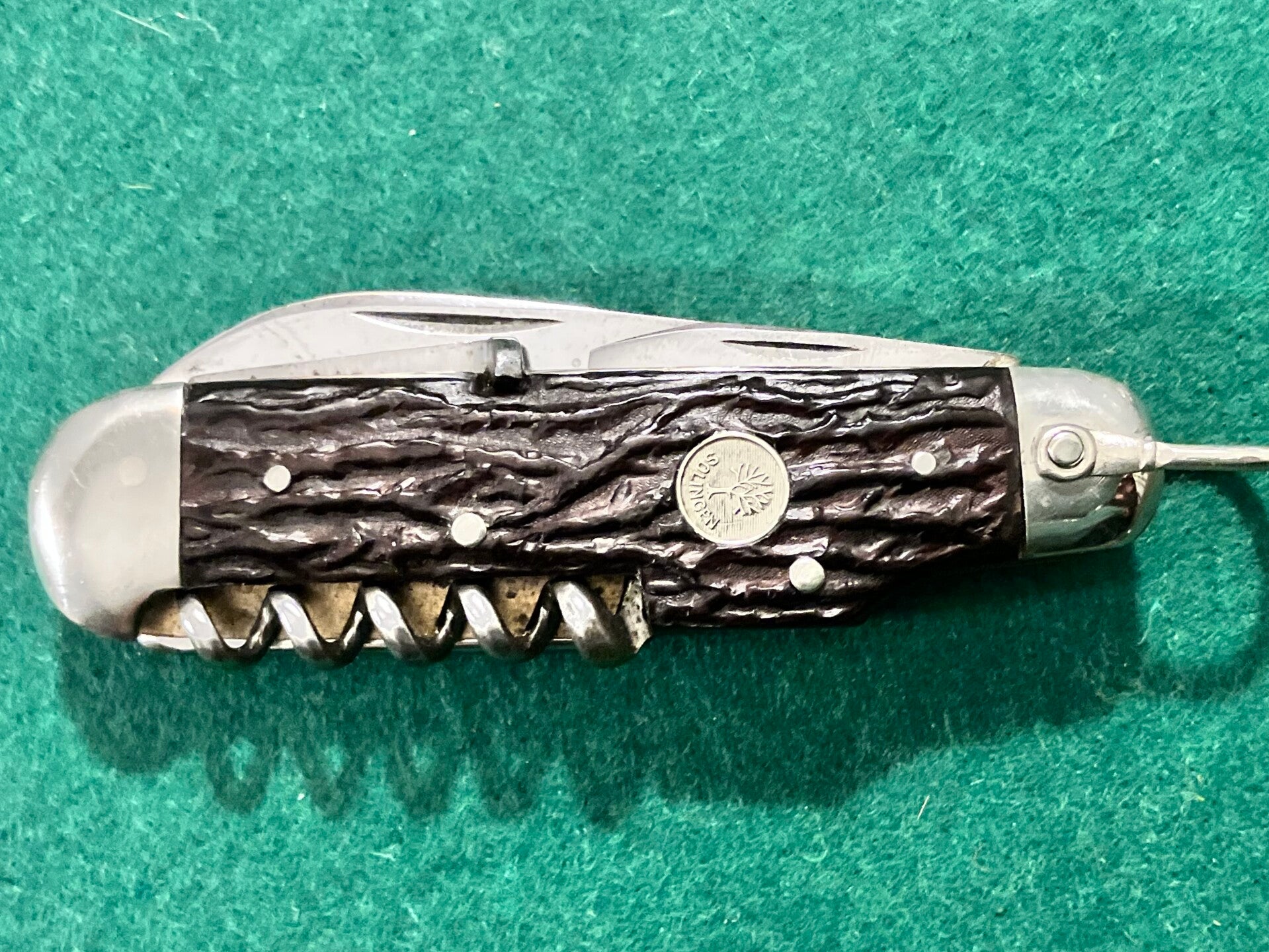 1950's Böker camp knife with synthetic scales. Overall condition is very good and appears to have had only very light use. A bit of patina here and there on the carbon steel blades but minimal. Snap is excellent with no play. Blade length approx 62mm.