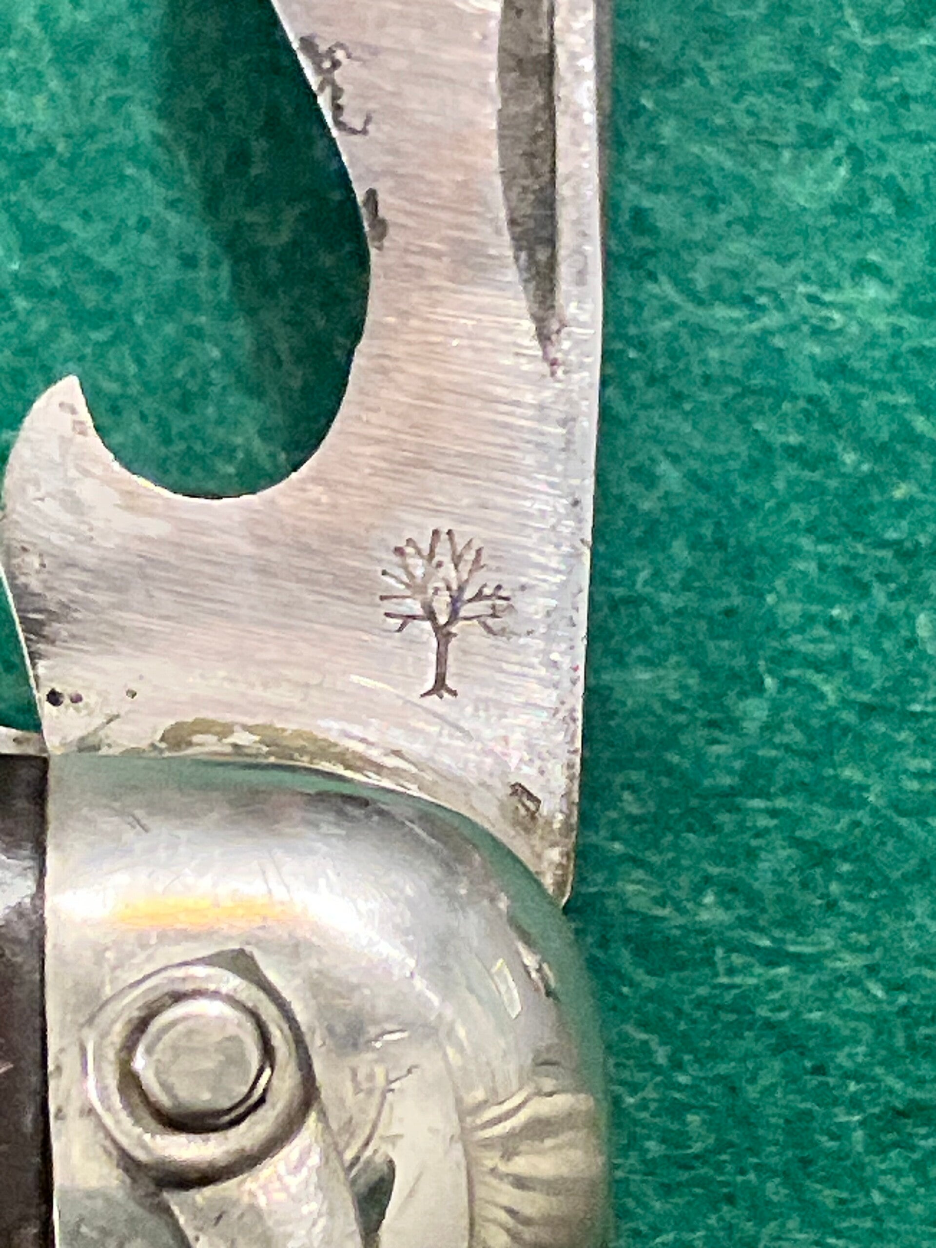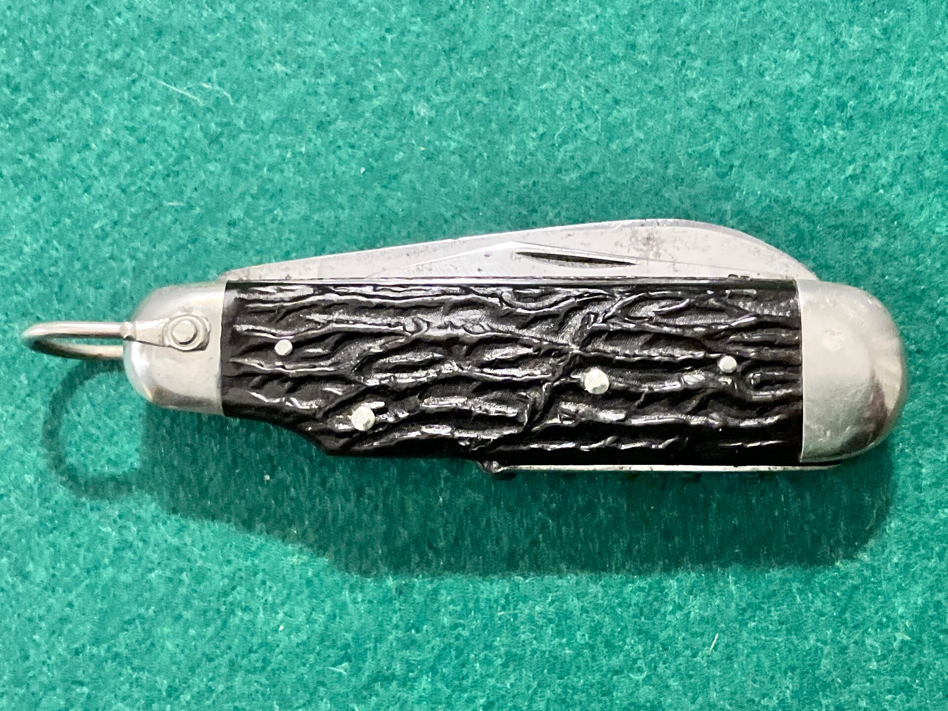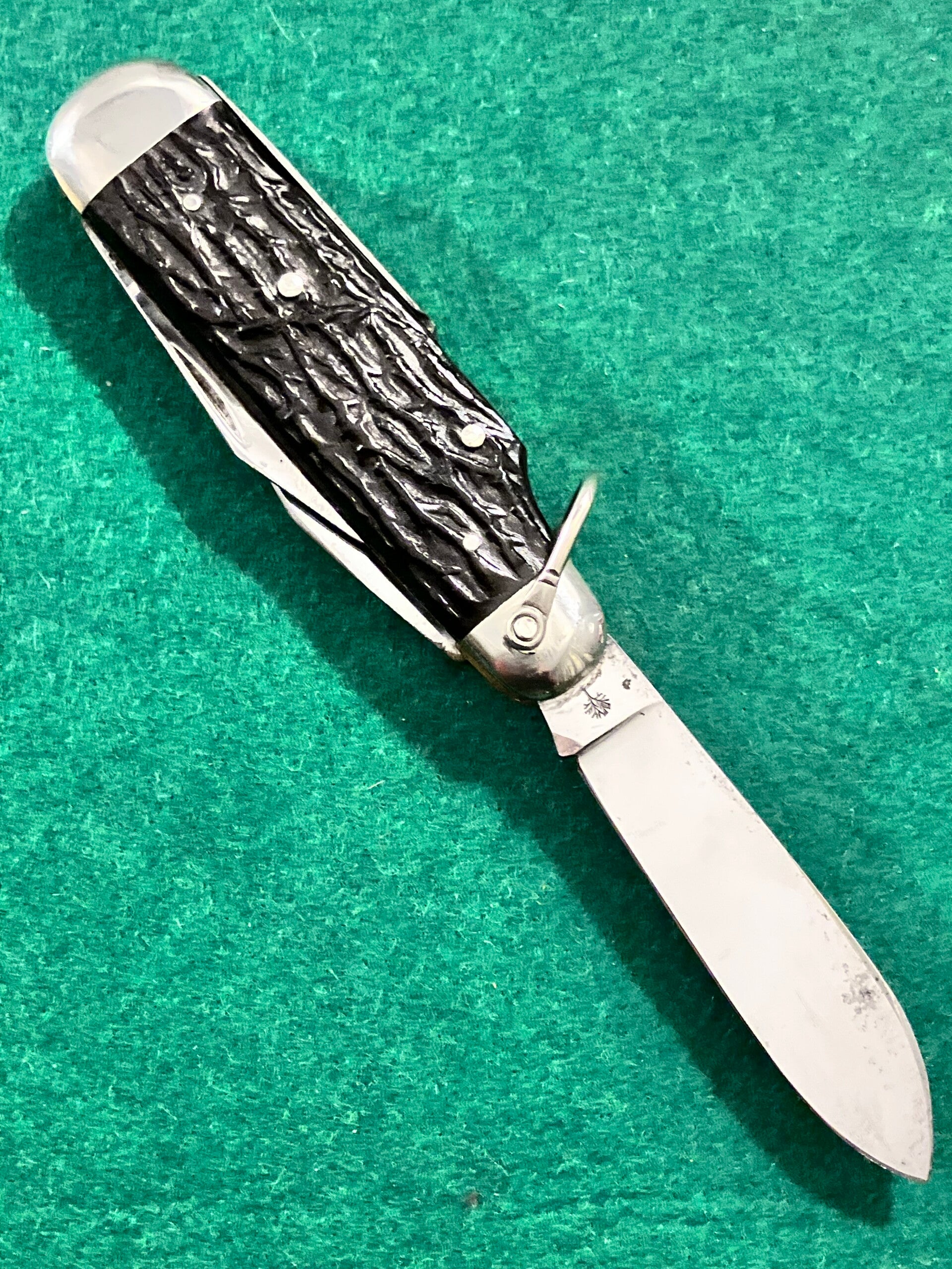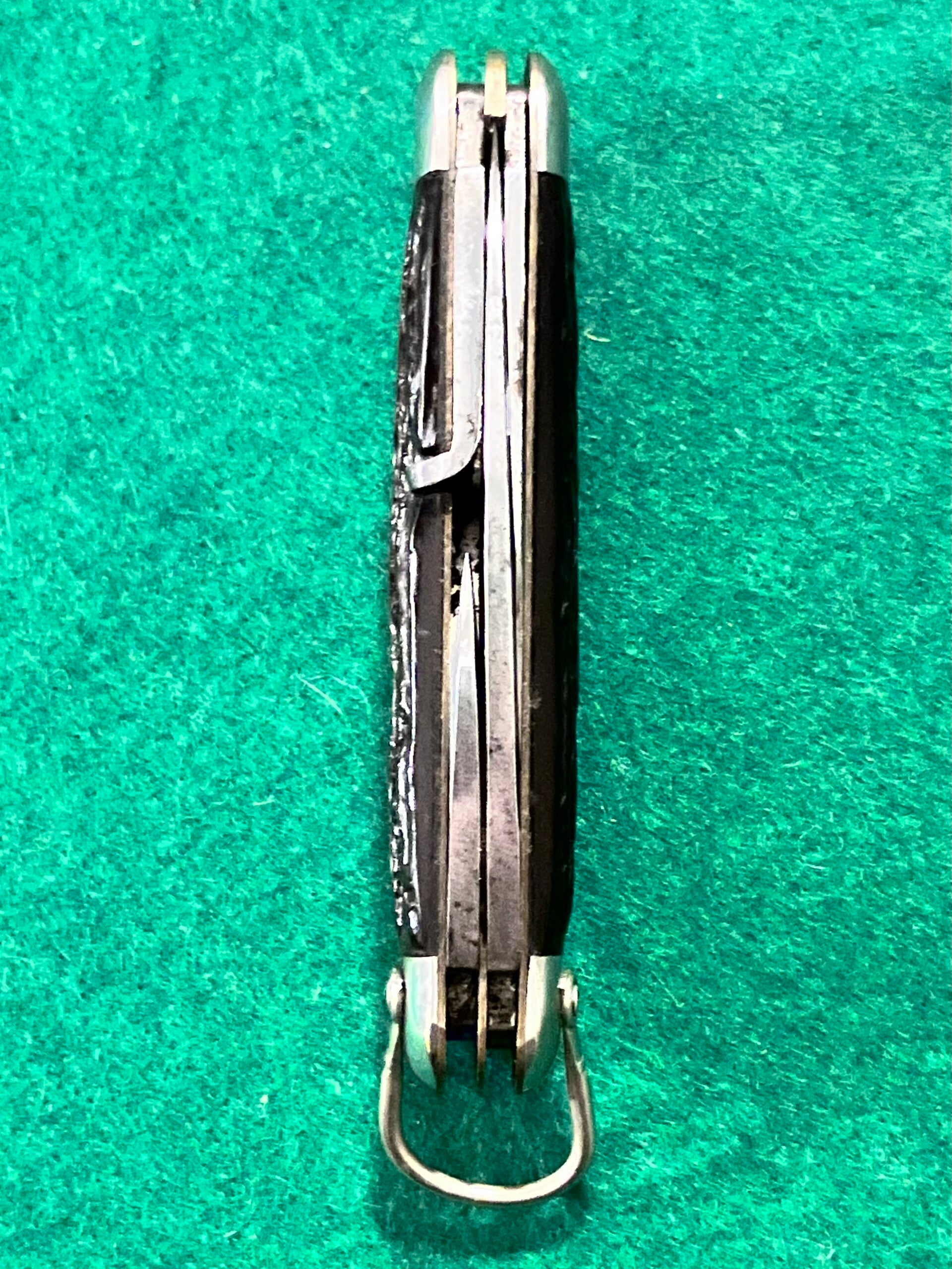 1950's Böker camp knife with synthetic scales. Overall condition is very good and appears to have had only very light use. A bit of patina here and there on the carbon steel blades but minimal. Snap is excellent with no play. Blade length approx 62mm.