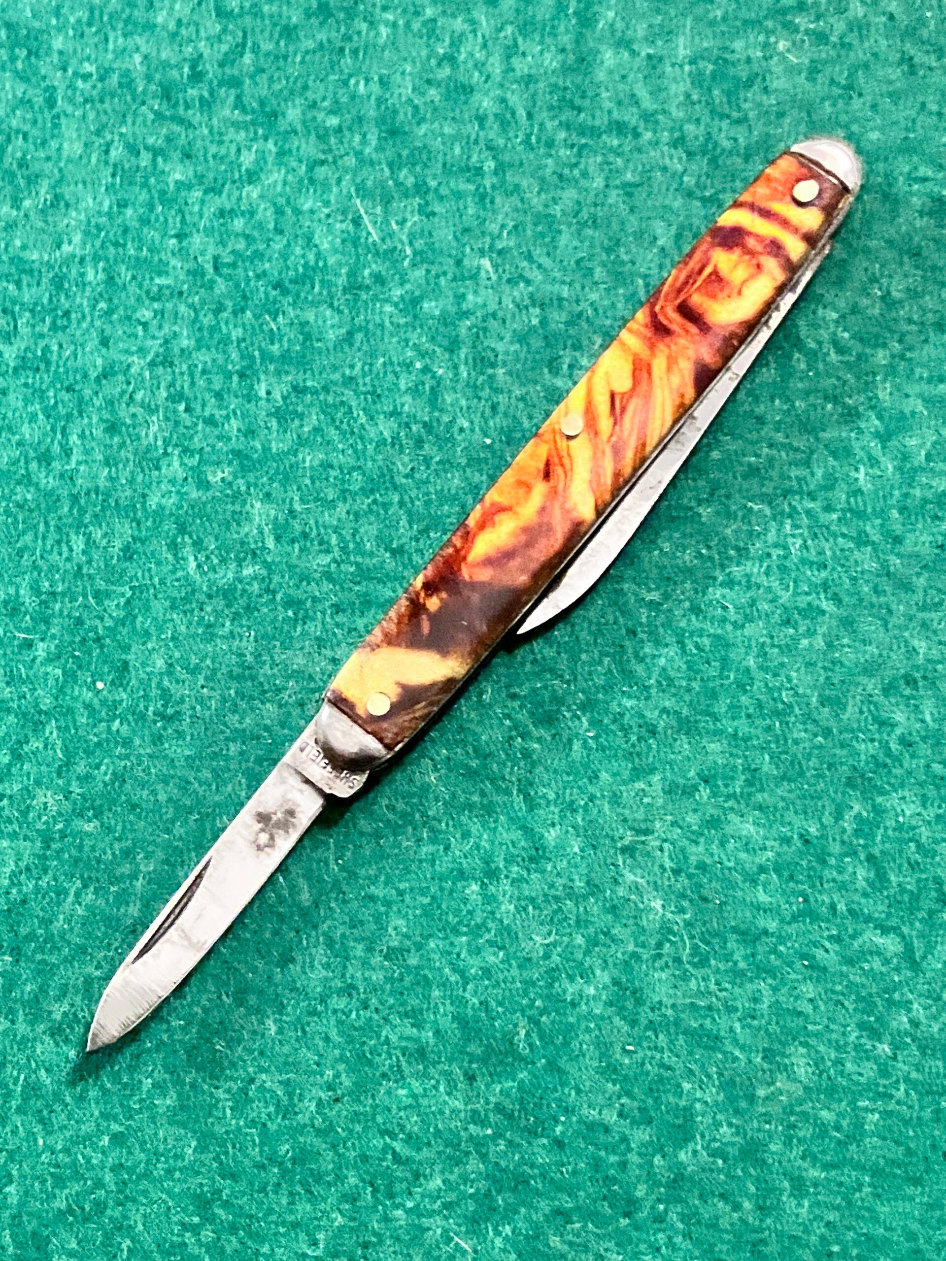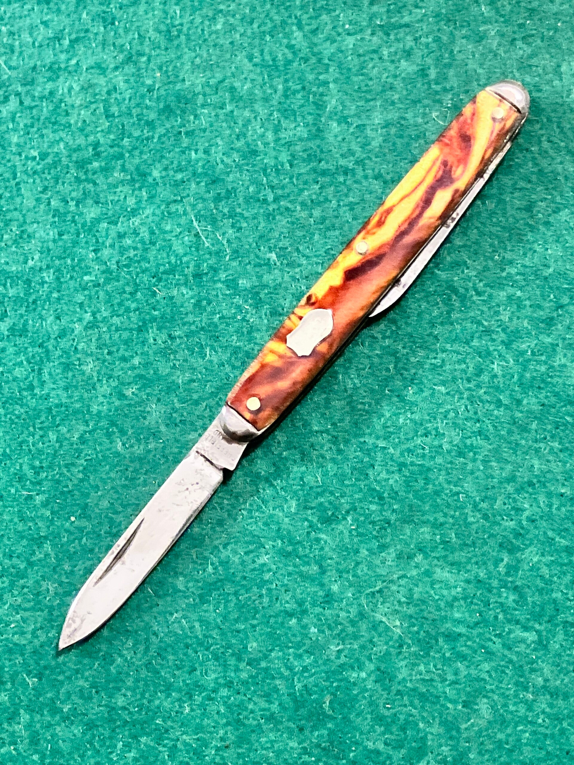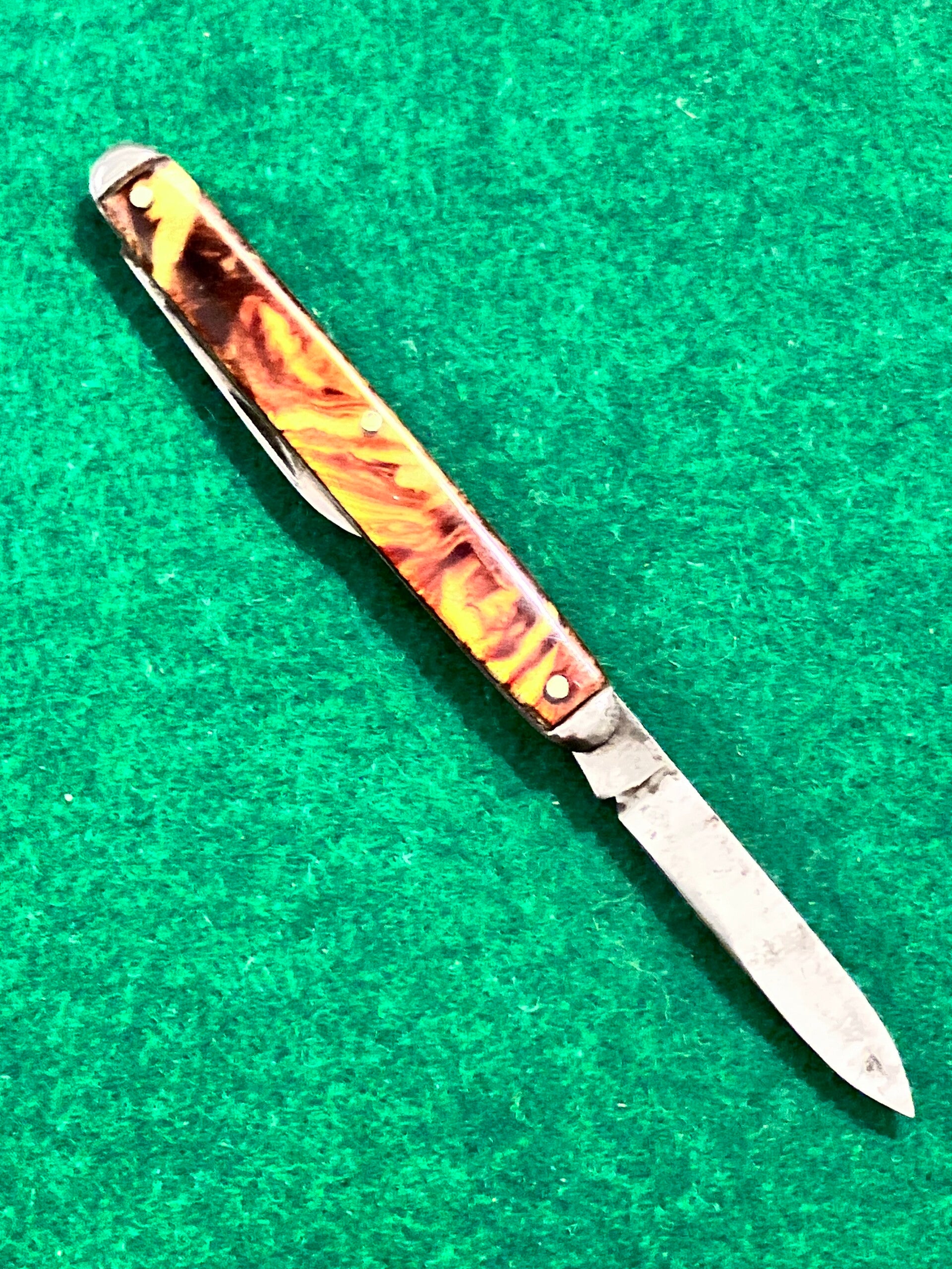 Attractive imitation tortoishell vintage penknife with carbon steel blades and bolsters. Some marks/blemishes to blades but very little wear. Good snap with a small amount of sideways play to main blade. Main blade length approx 42mm.