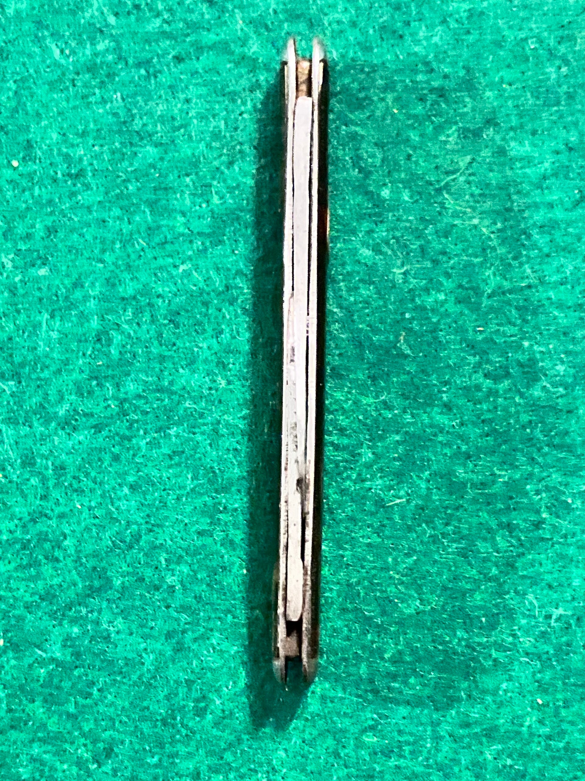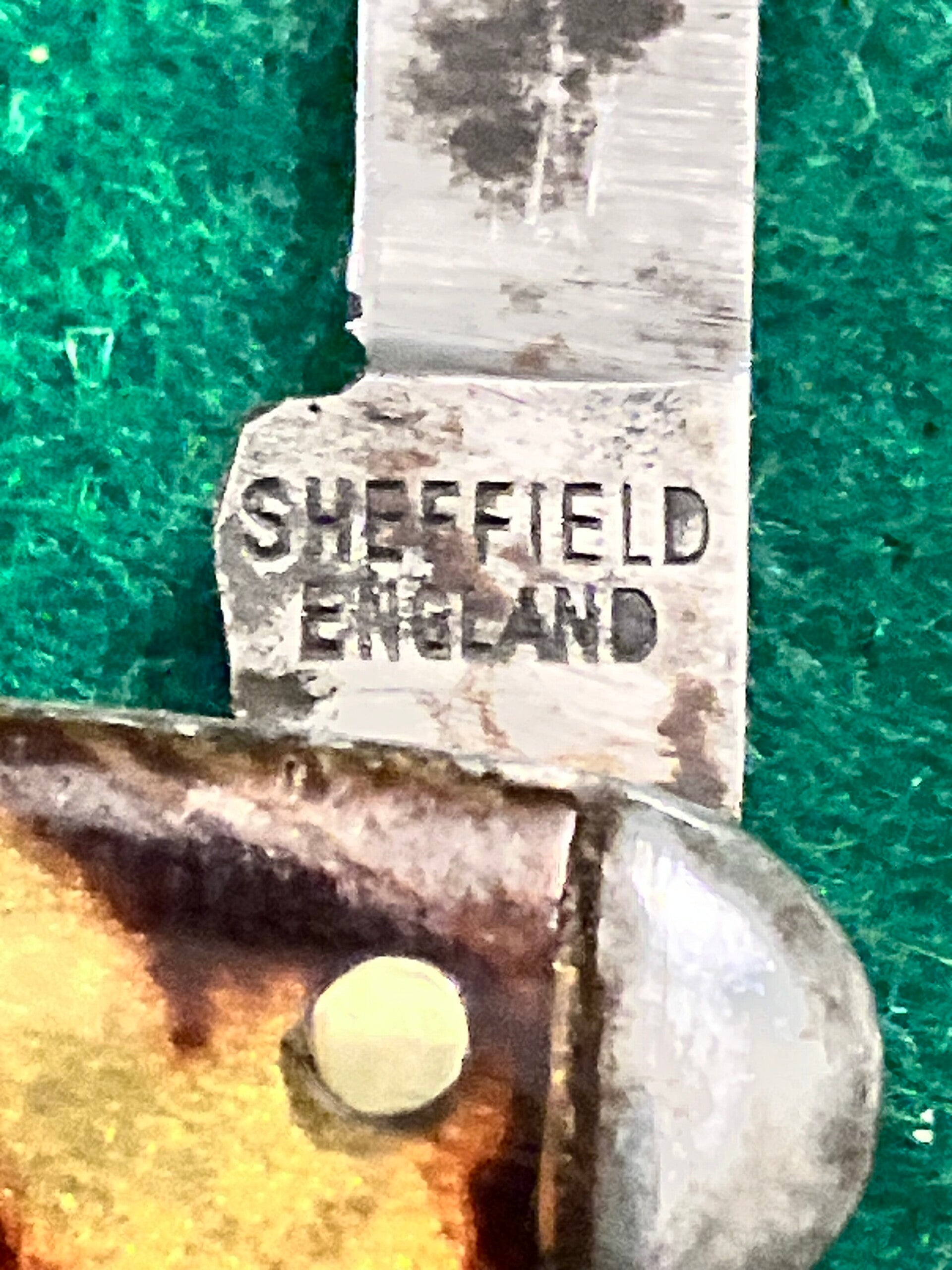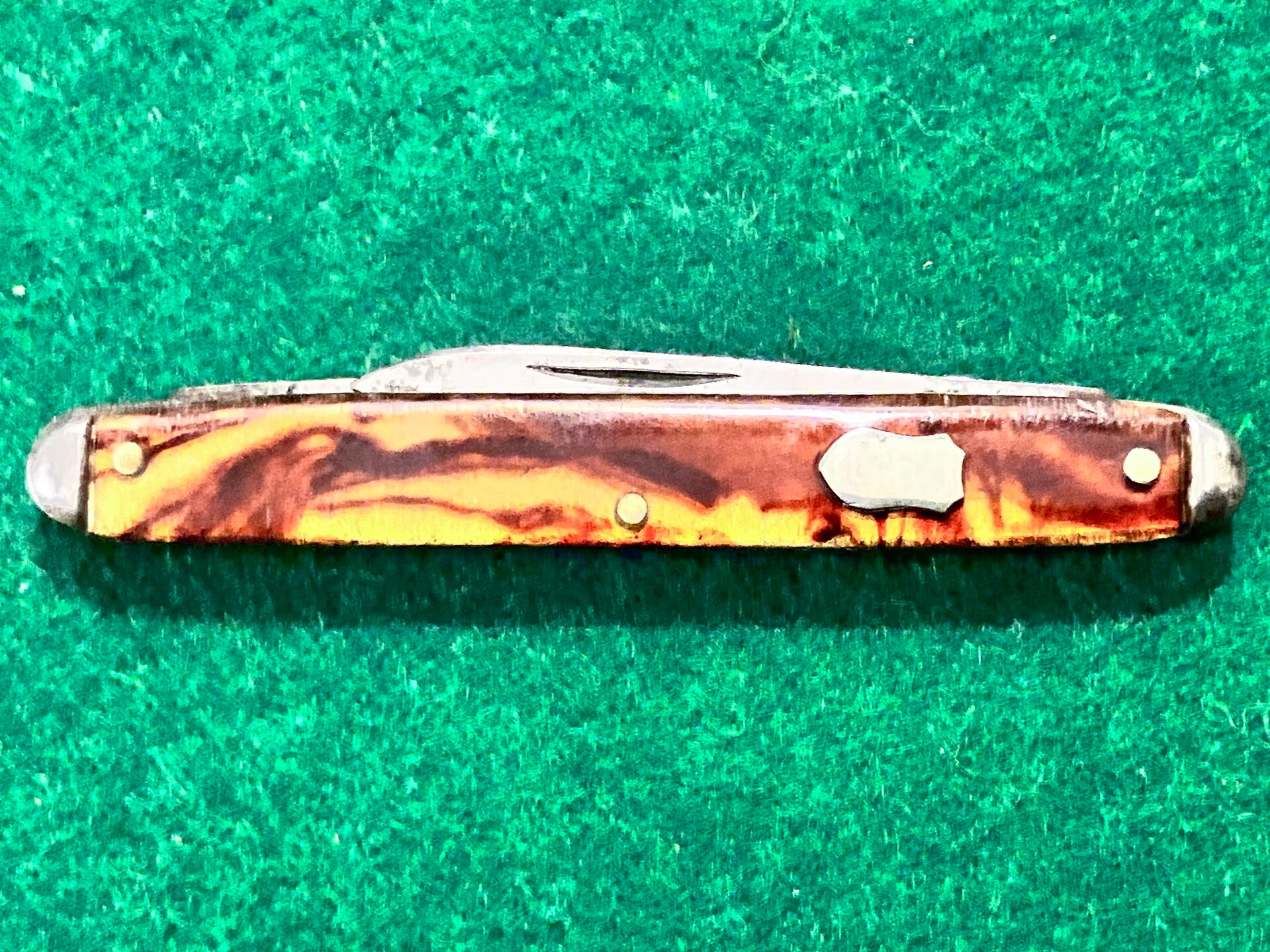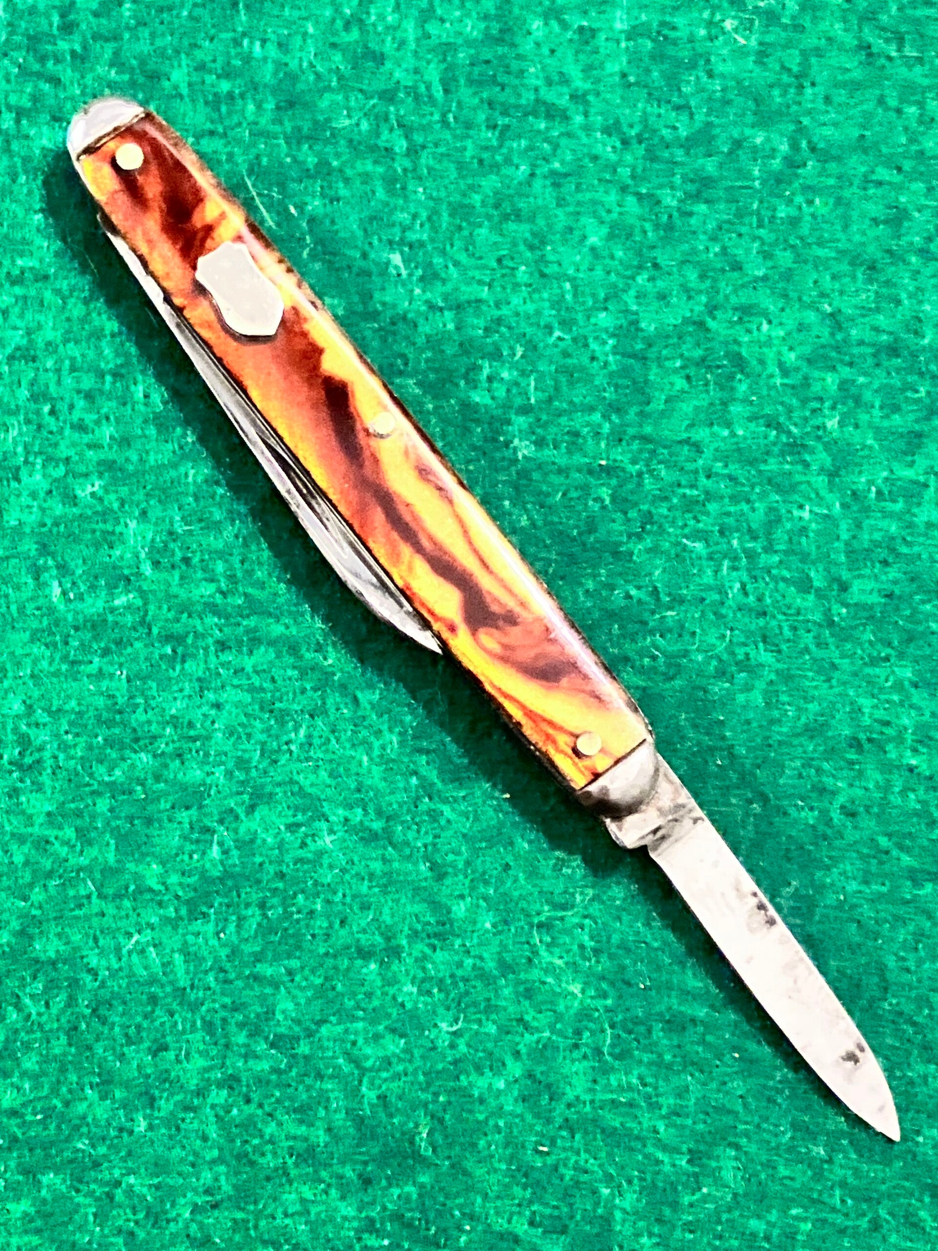 Attractive imitation tortoishell vintage penknife with carbon steel blades and bolsters. Some marks/blemishes to blades but very little wear. Good snap with a small amount of sideways play to main blade. Main blade length approx 42mm.