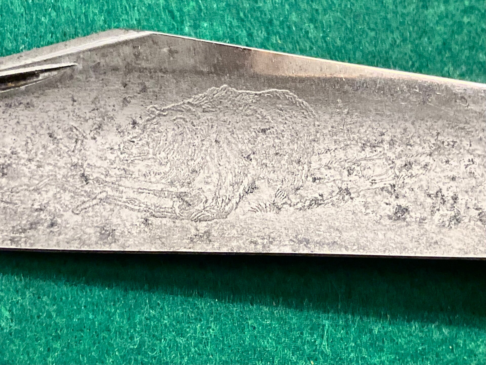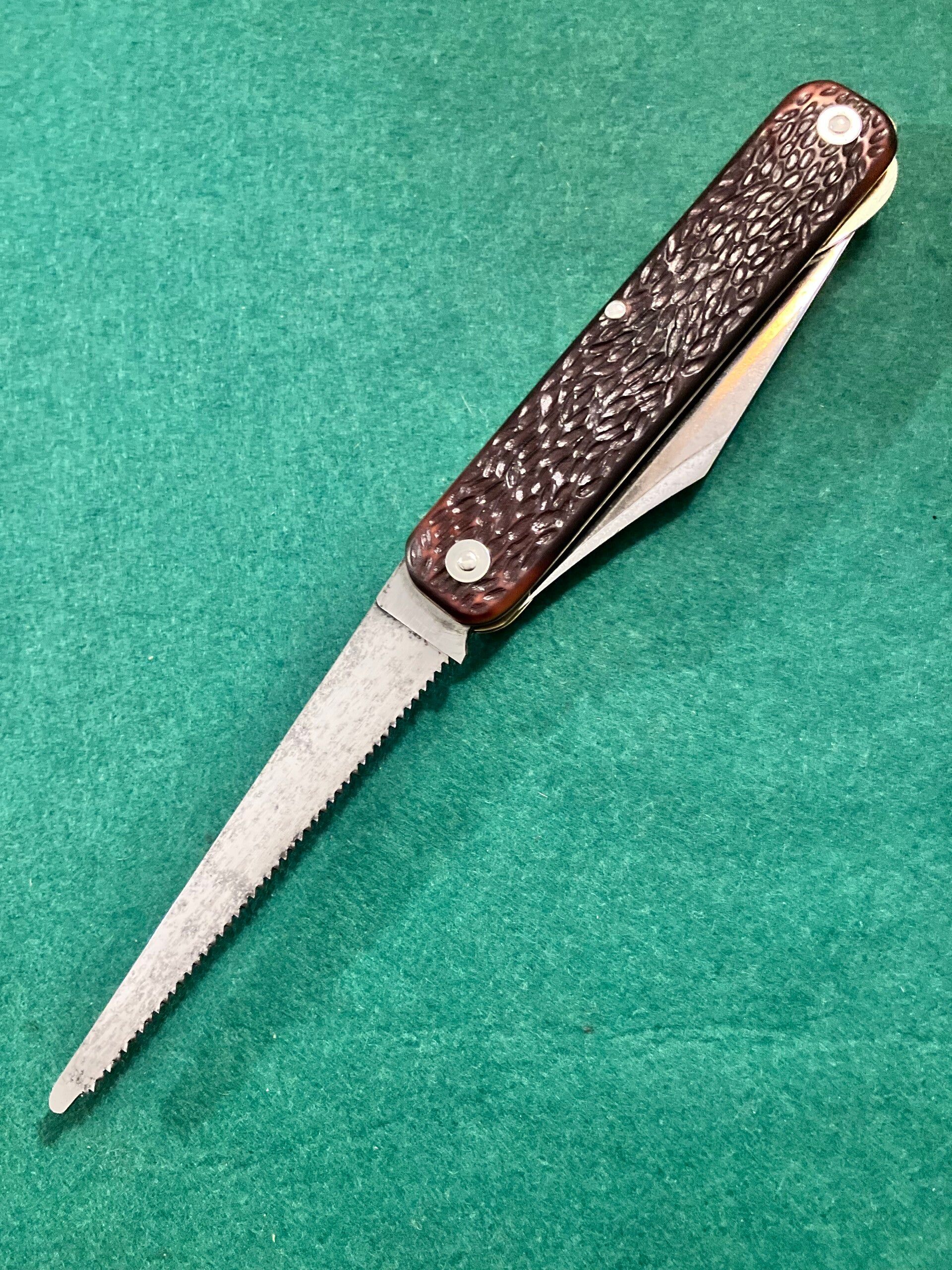 Large American made Ranger knife with locking knife blade. Scales are jigged delrin. Blade has the correct etching of a grizzly bear but unusually no makers mark to the tang. Saw teeth still nice and sharp. Blade length approx 119mm.