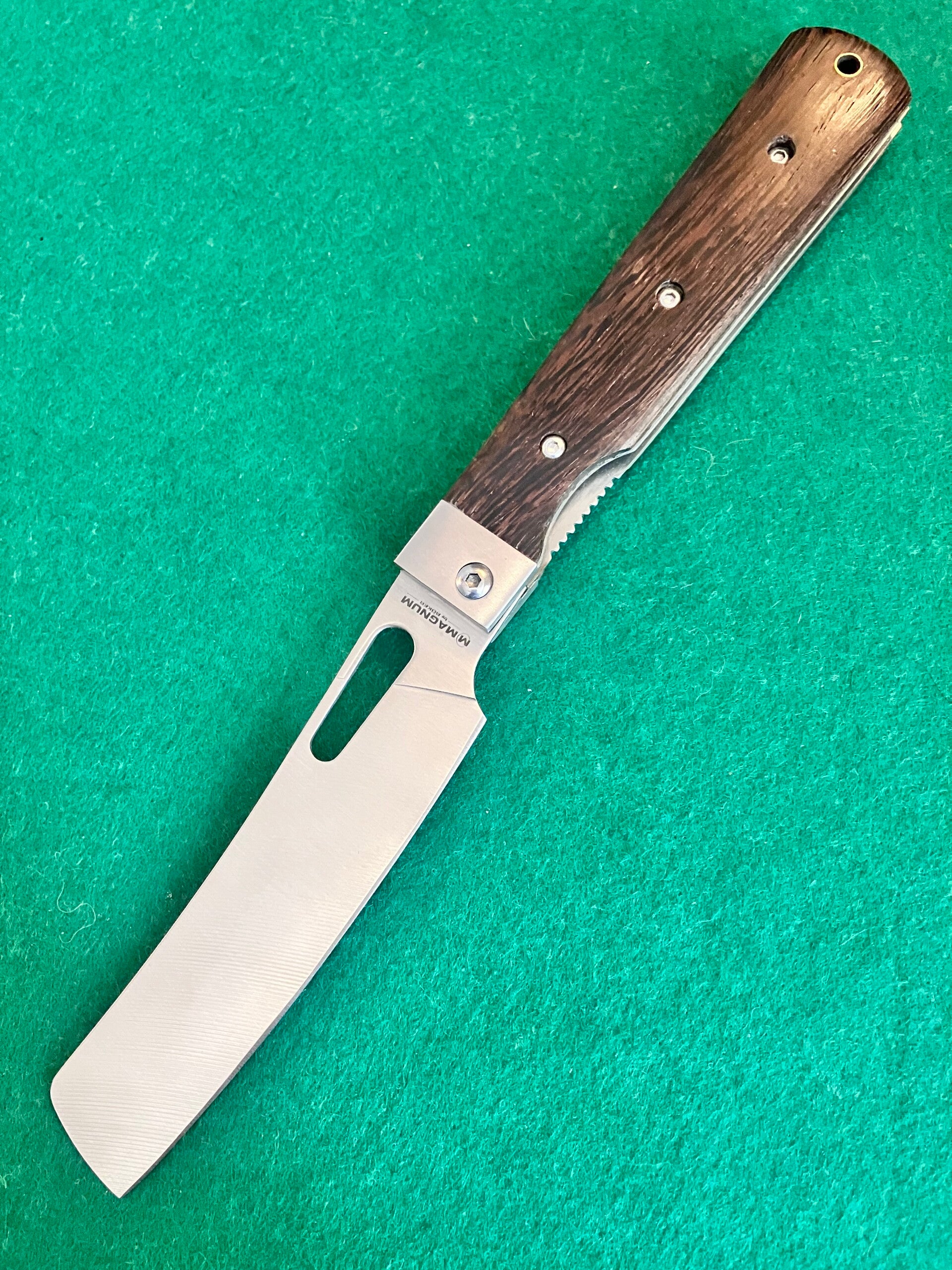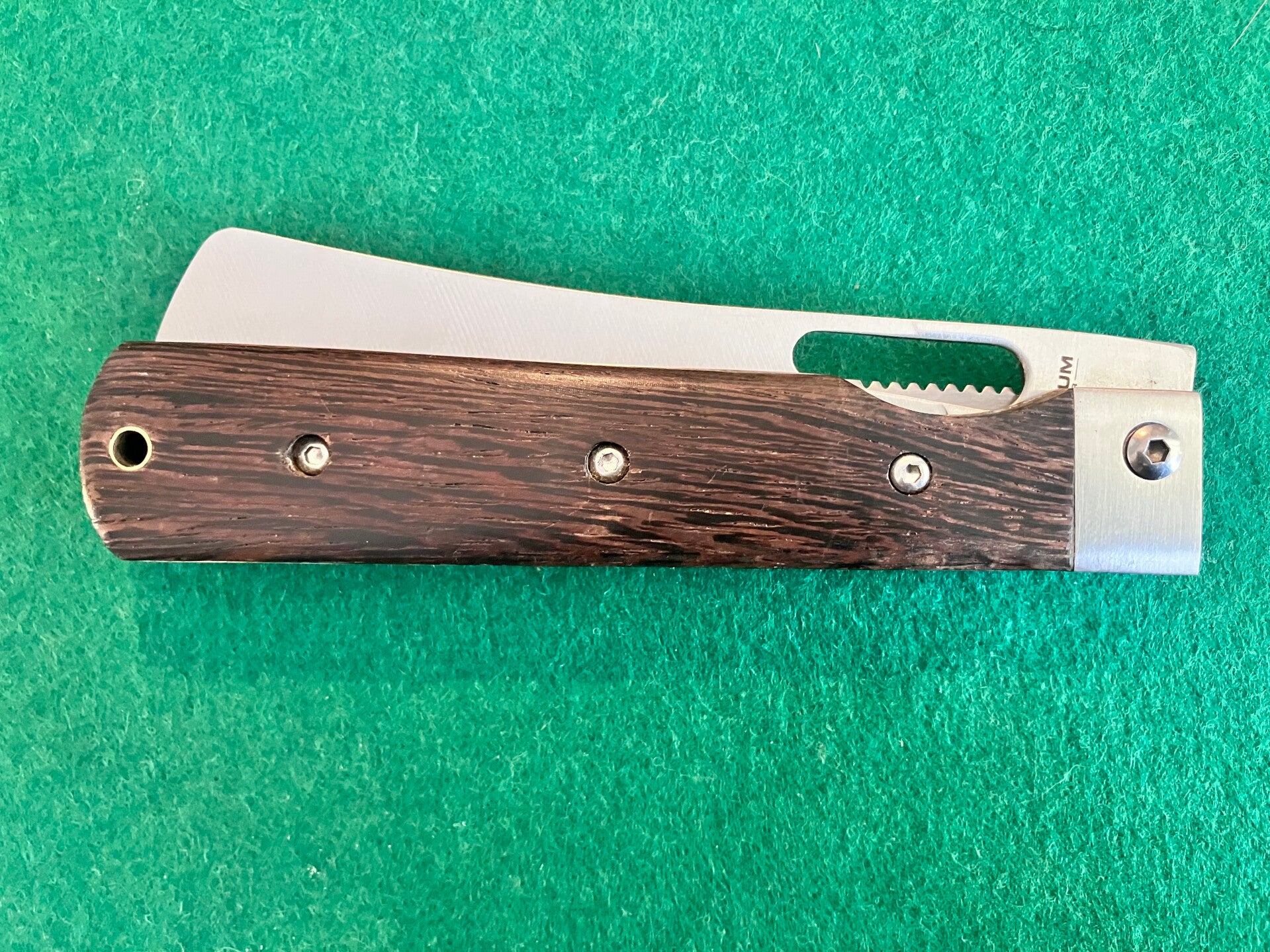 Large food prep knife with liner lock and wood scales. Other than a few marks to one scale which I have shown in the last pic the knife appears as new. Blade length approx 122mm. PHOTO ID REQUIRED BEFORE POSTING