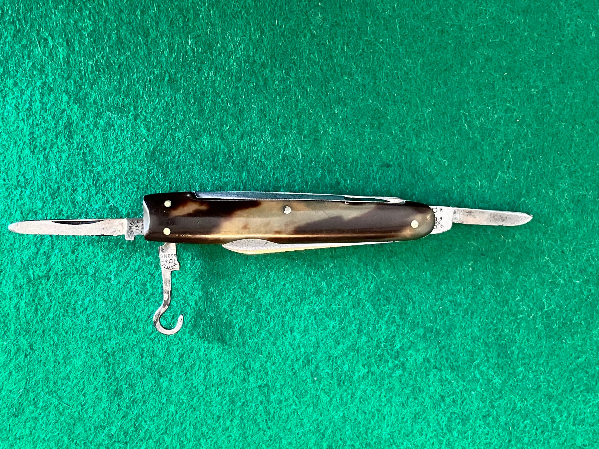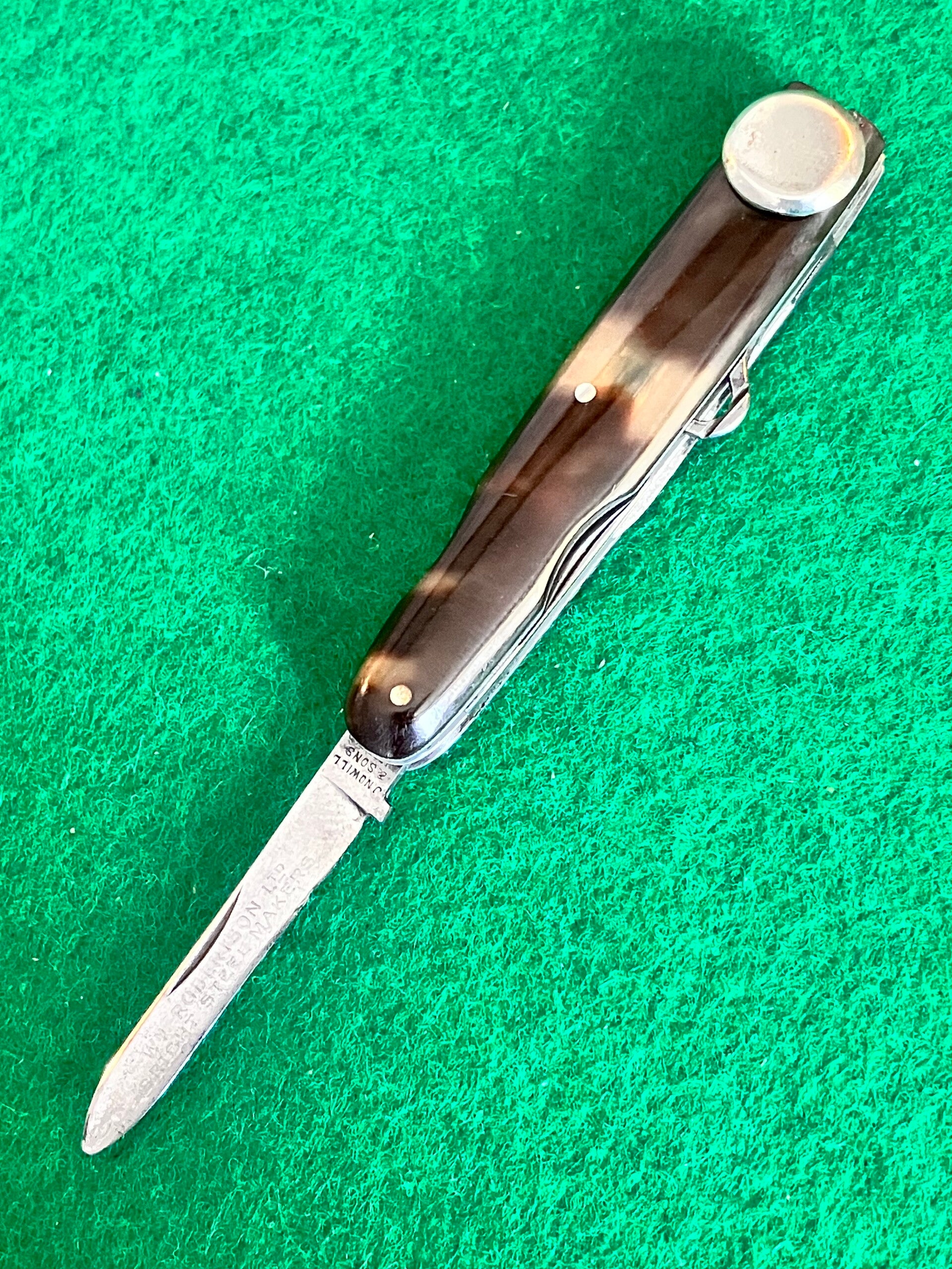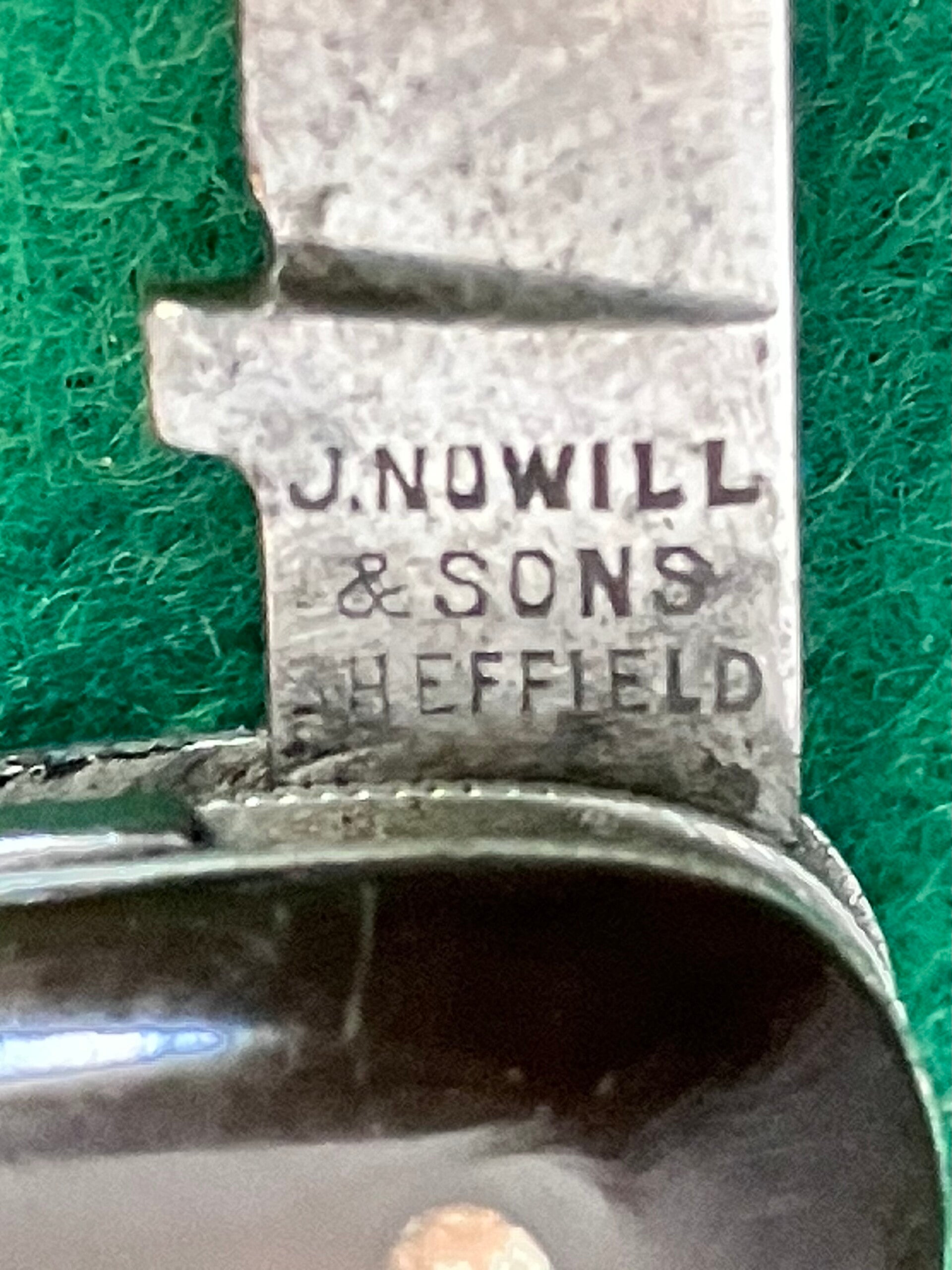 J Nowill smokers penknife with main blade marked for Wm Robertson, a steel manufacturer in Warrington. All tools have good snap & no play, scales in very good condition. Unusually nice for a promotional piece. Some wear to blades but overall condition is very good. Main blade length approx 43mm.