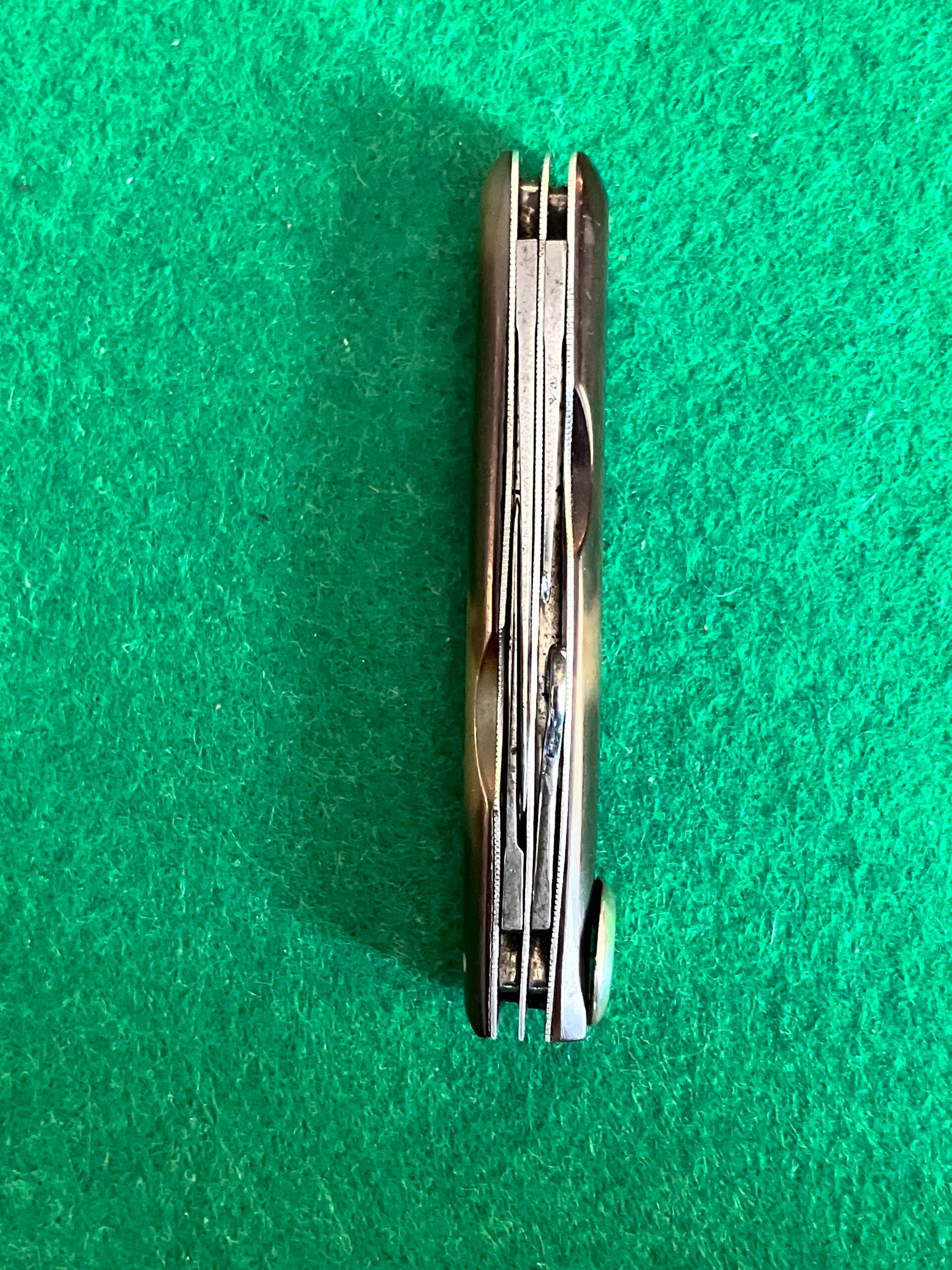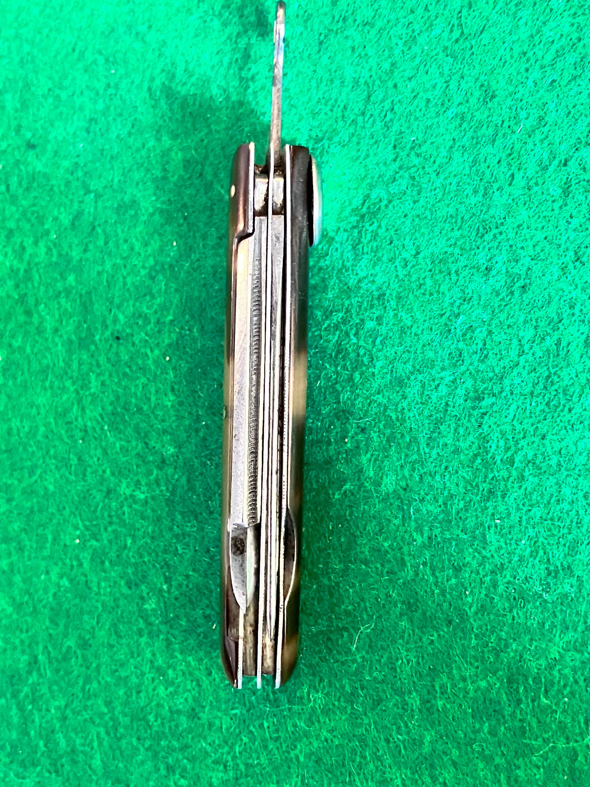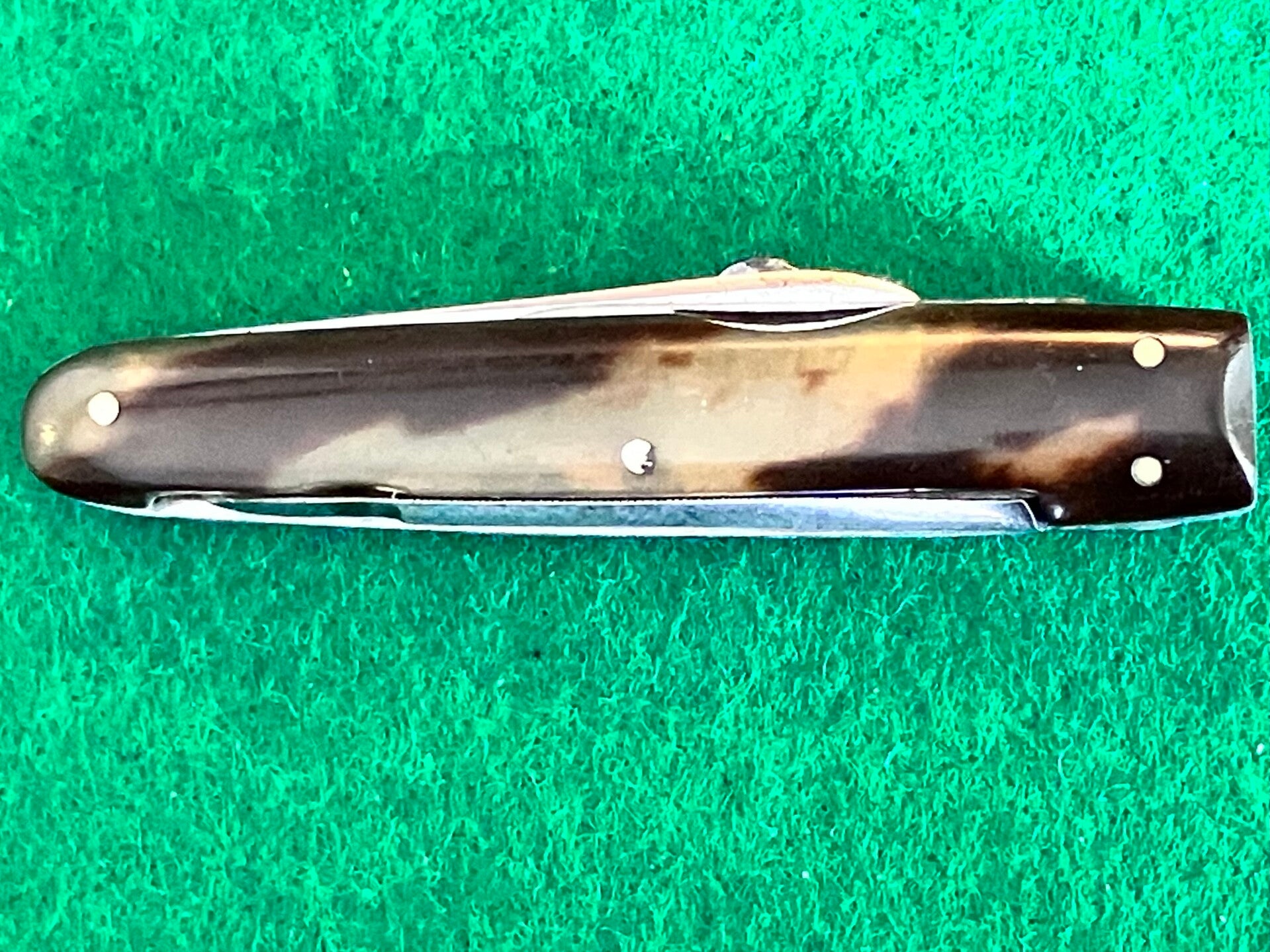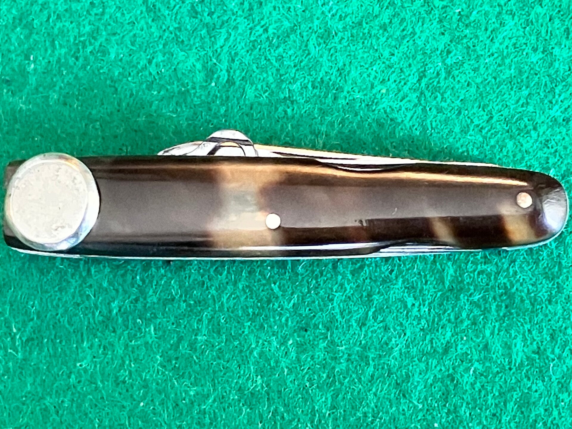 J Nowill smokers penknife with main blade marked for Wm Robertson, a steel manufacturer in Warrington. All tools have good snap & no play, scales in very good condition. Unusually nice for a promotional piece. Some wear to blades but overall condition is very good. Main blade length approx 43mm.