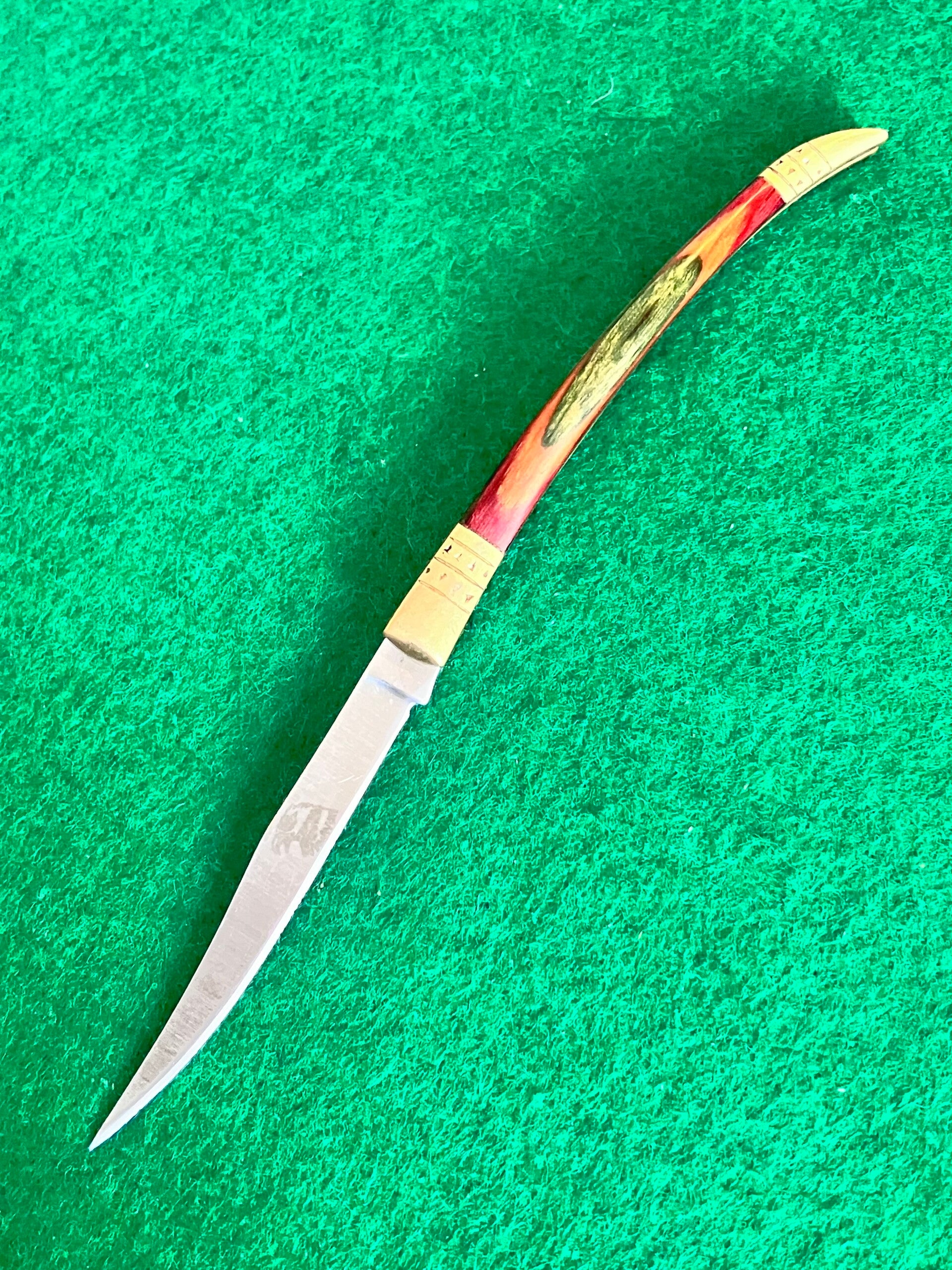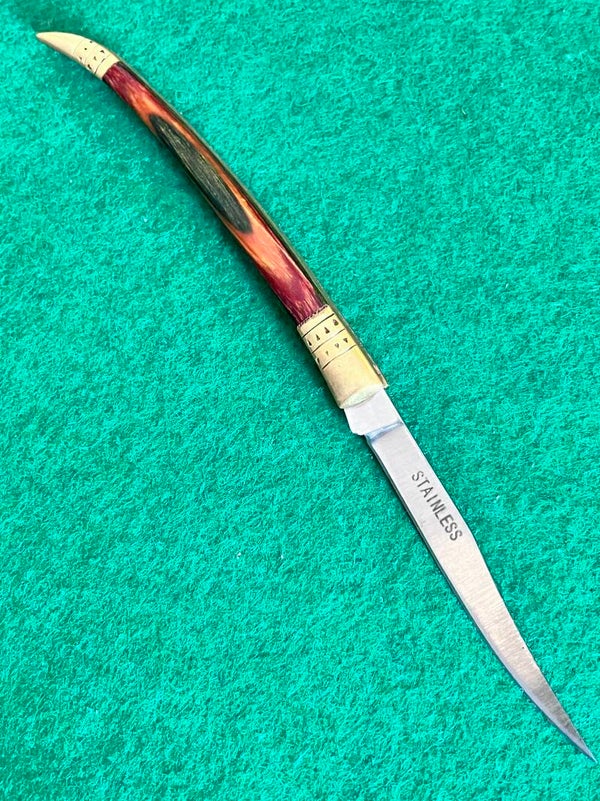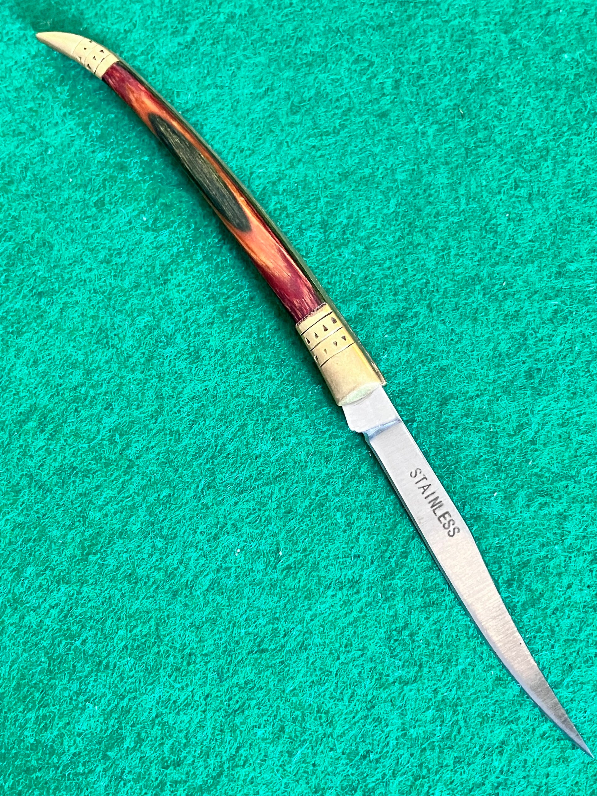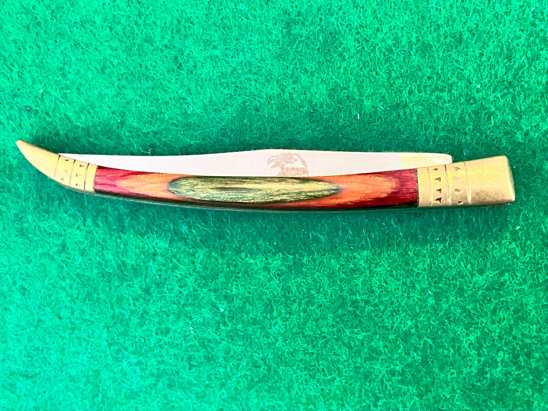 Small recently made Vendetta style, unsure of origin. Stainless blade with wooden scales. A bit stiff to open, snaps shut ok. Blade length approx 64mm. PHOTO ID REQUIRED BEFORE POSTING