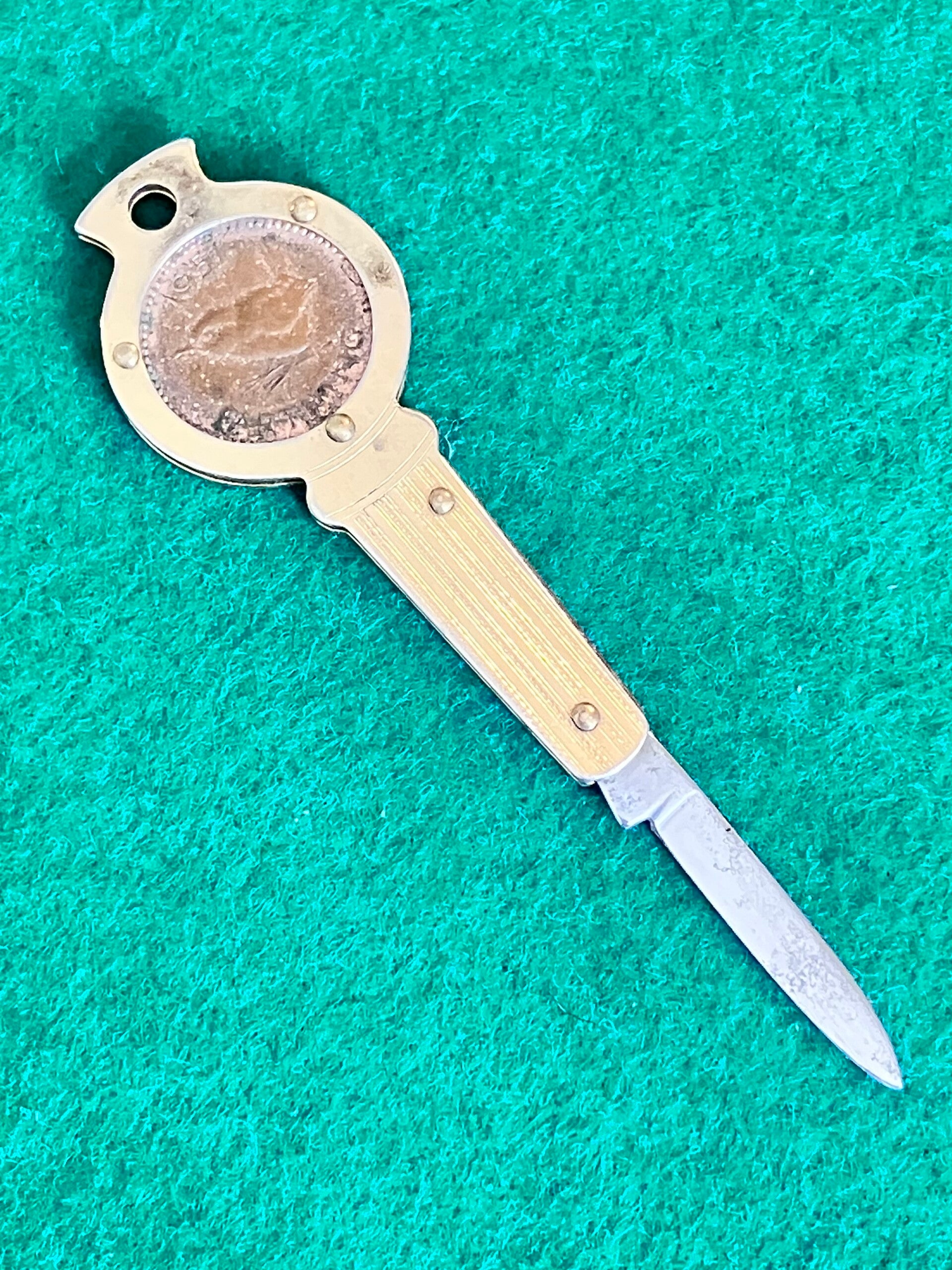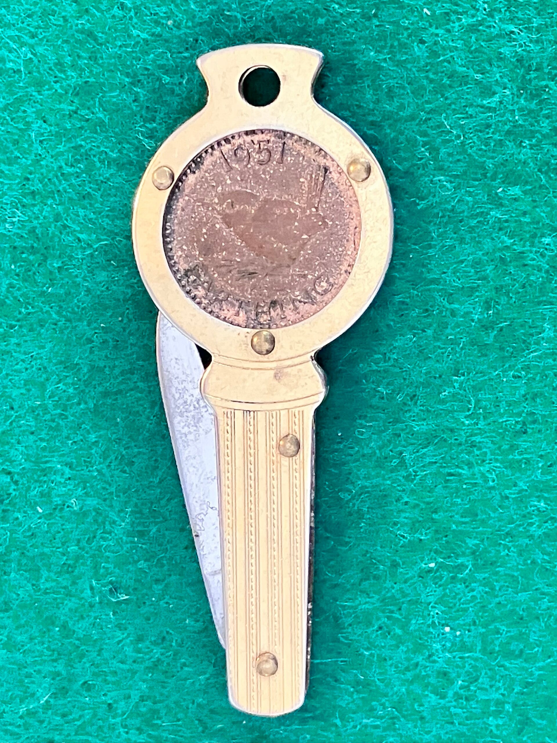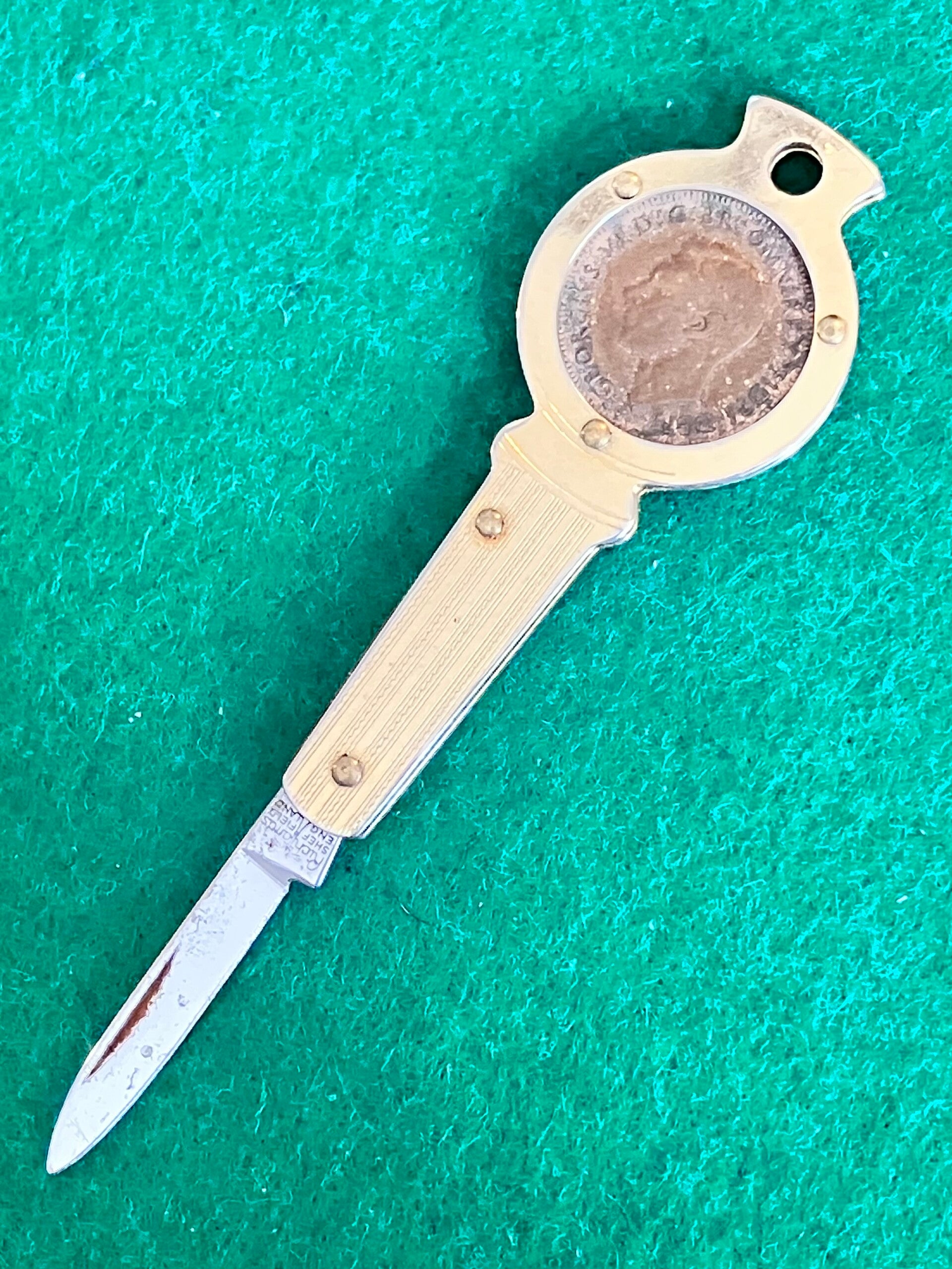 Richards of Sheffield keyring knife with inset 1951 farthing. Decent condition for its age. Made circa 1960/70. Good snap & no play. Blade length approx 33mm. PHOTO ID REQUIRED BEFORE POSTING