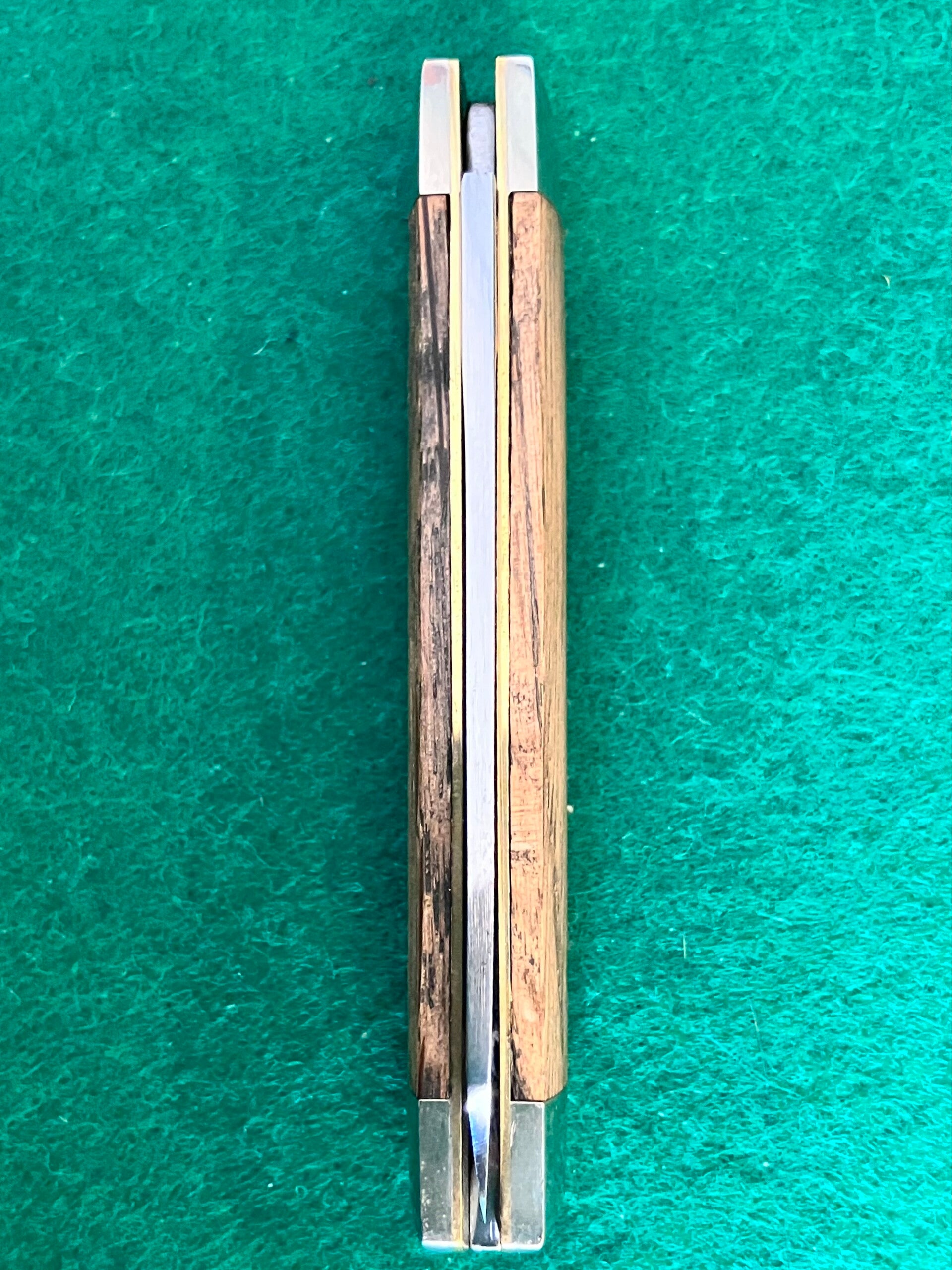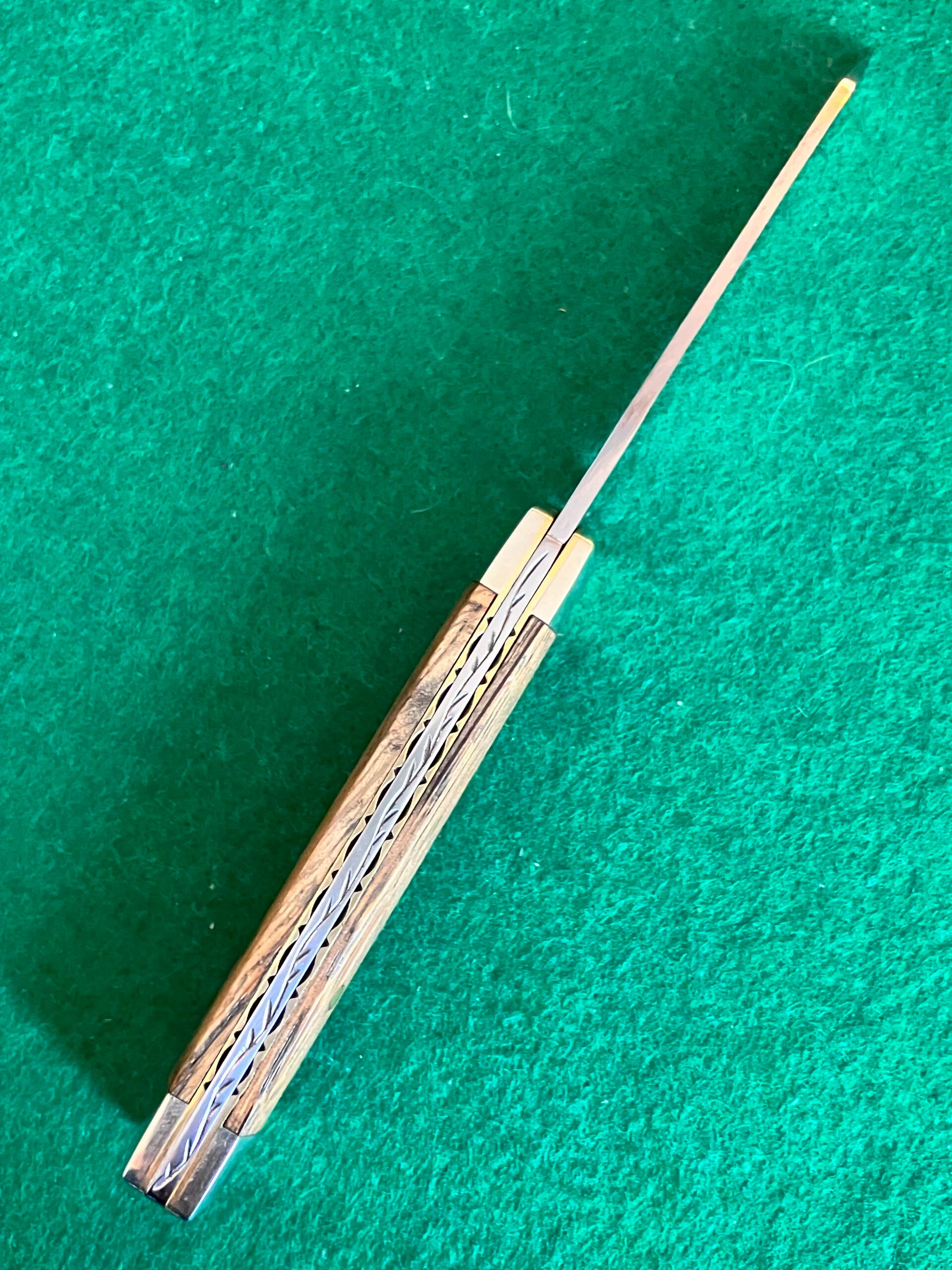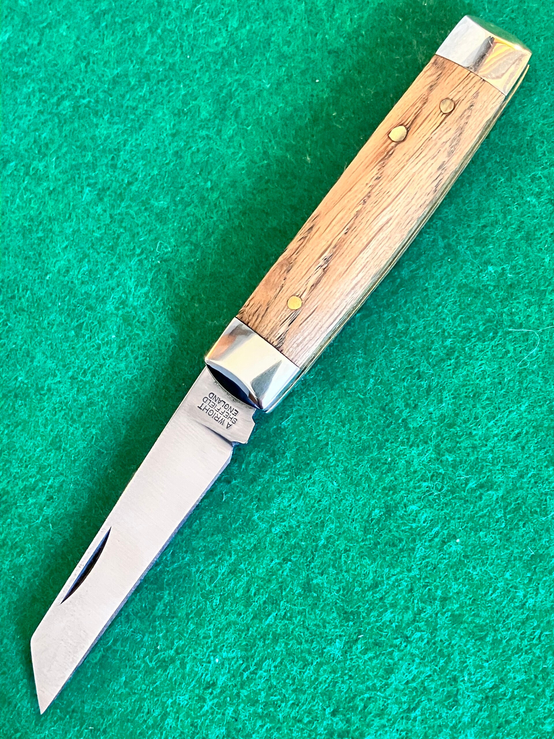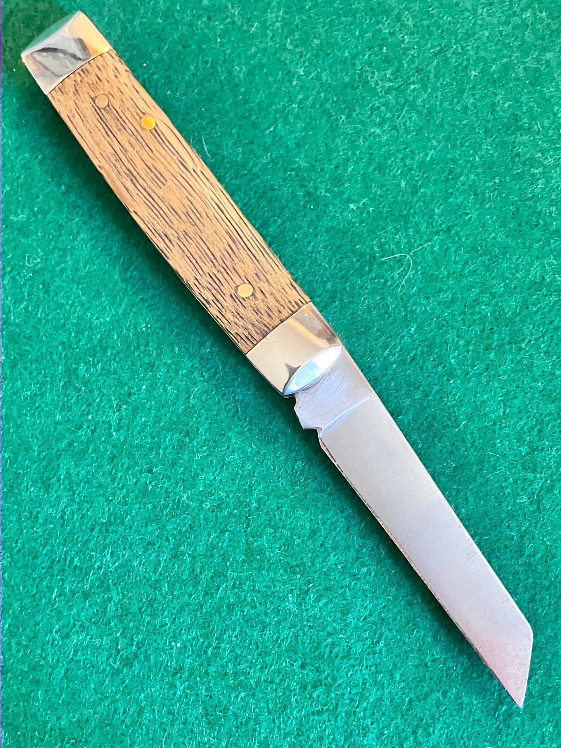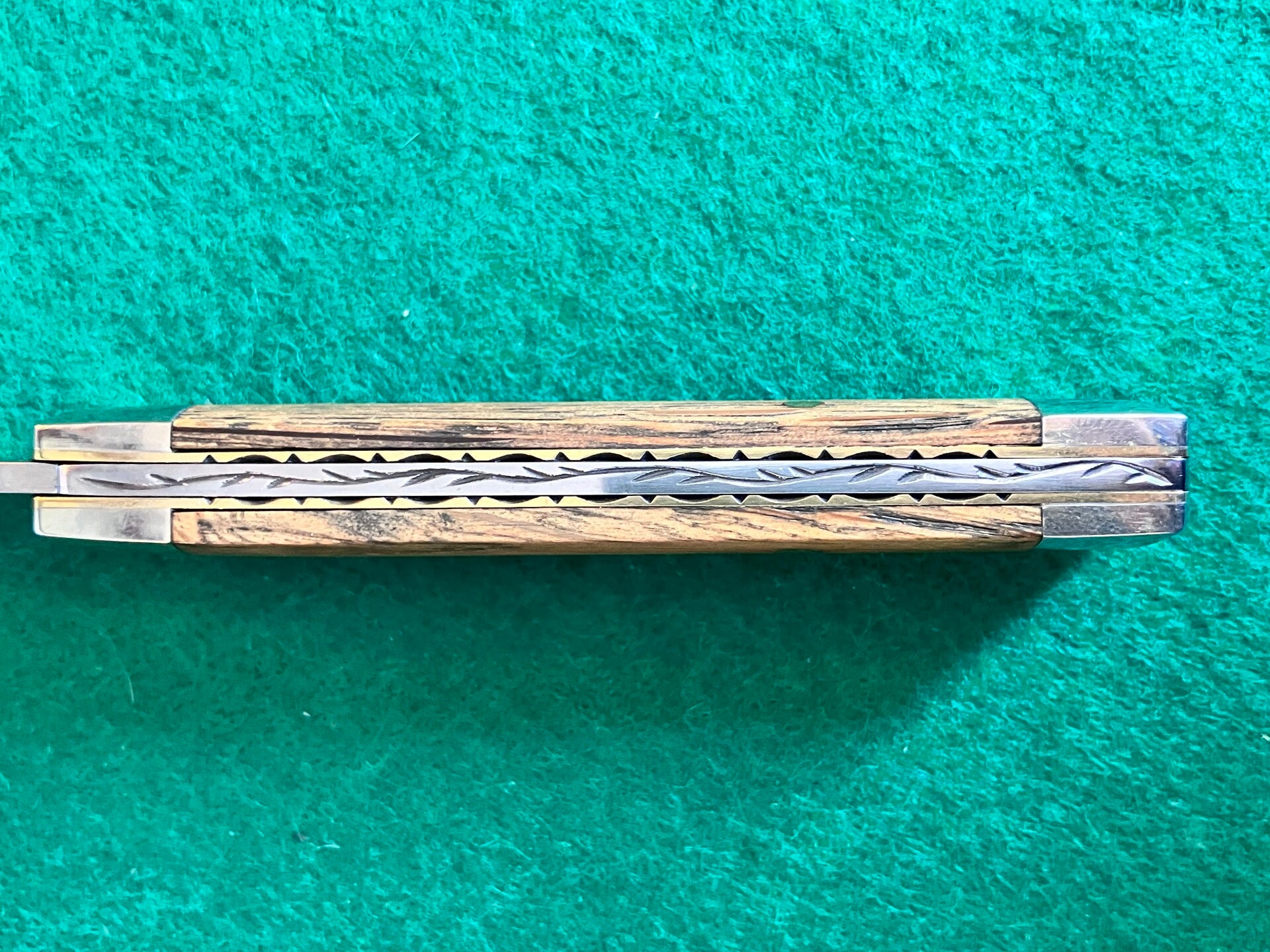 Never used or carried, this Senator is in superb condition. Chased backspring with whiskey barrel oak scales. Excellent snap & no play. Blade length approx 71mm.