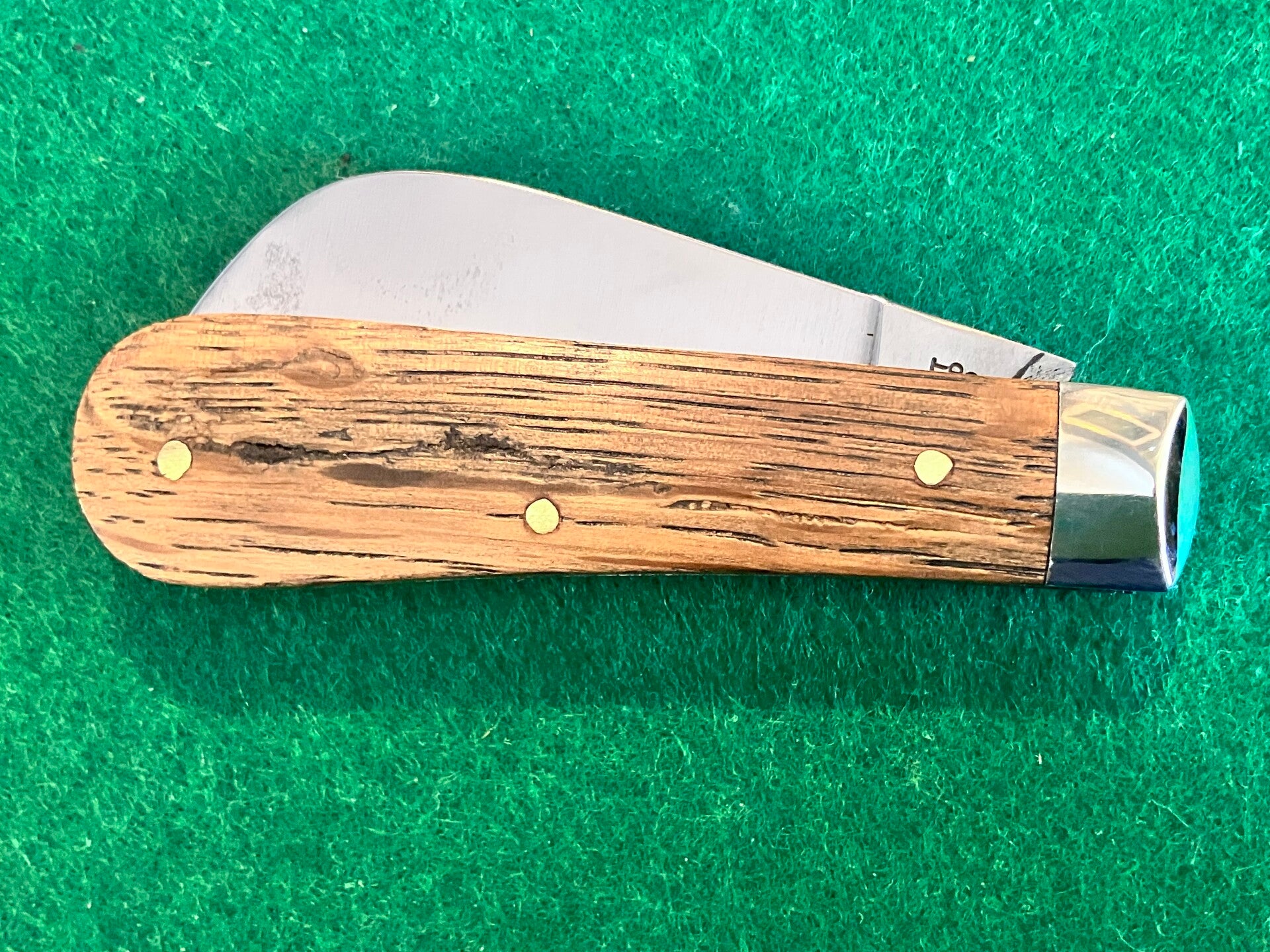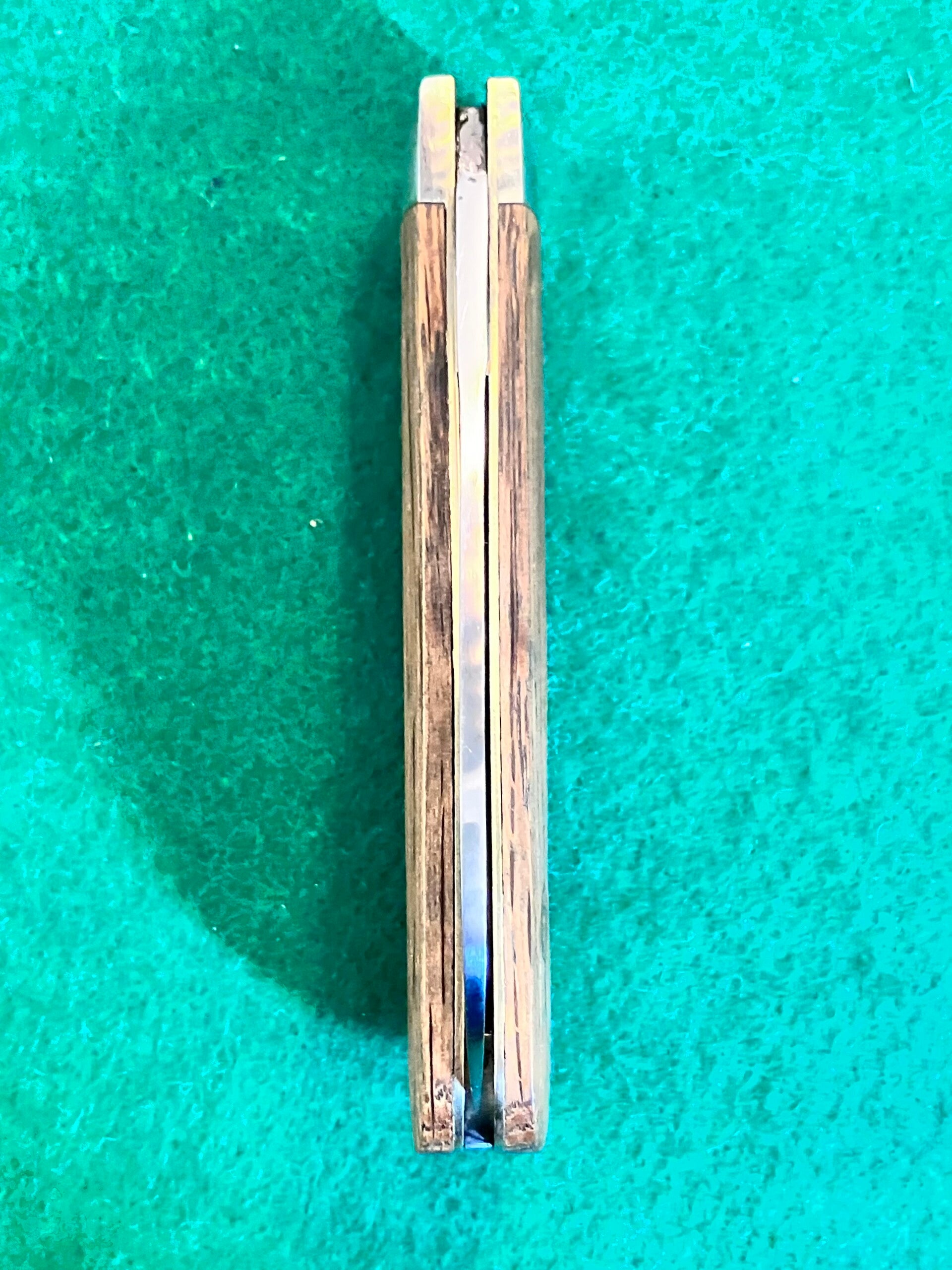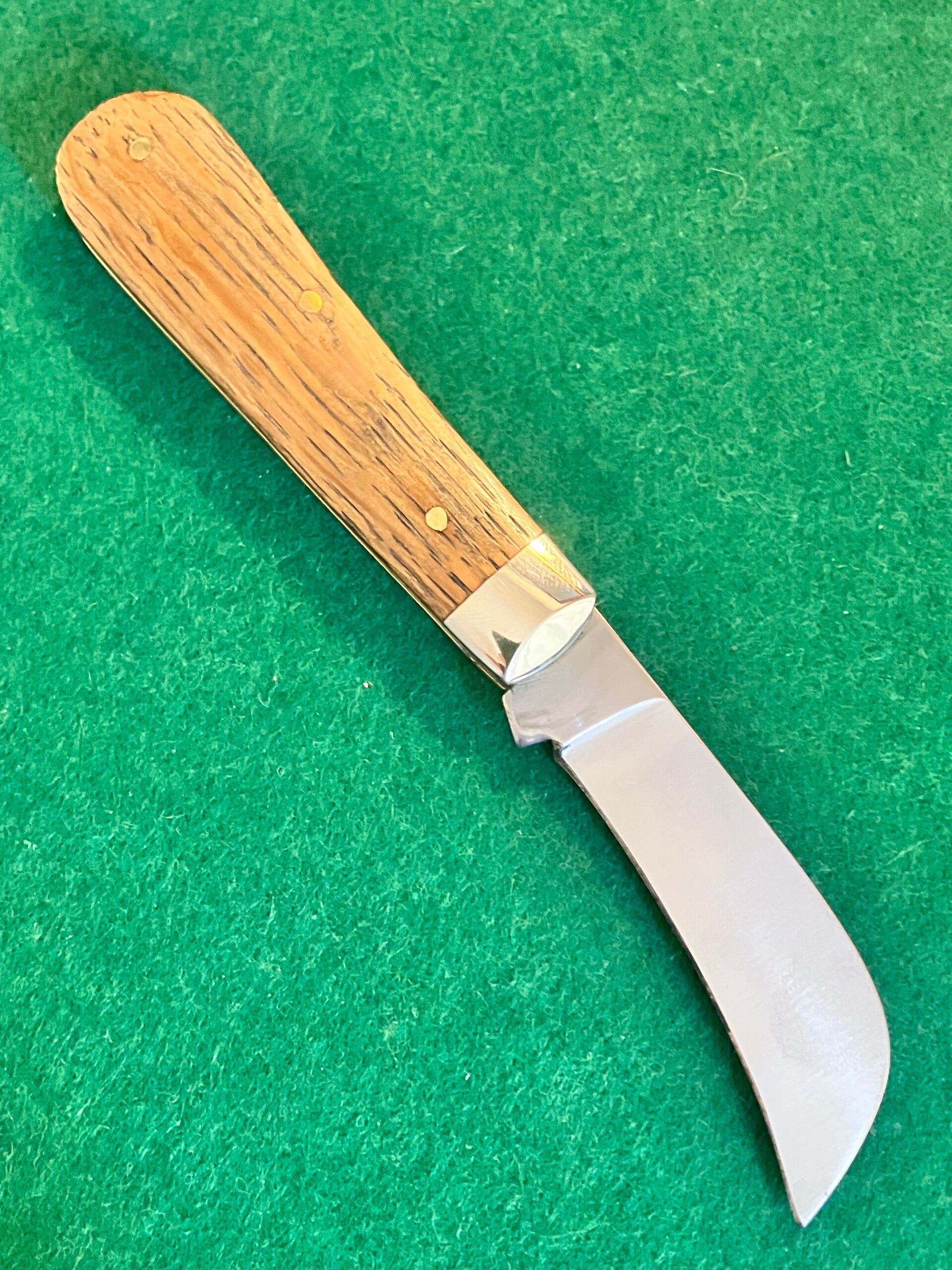 In unused condition but has some light surface patination from storage. Whiskey oak barrel scales. Very strong snap & no play. Blade length approx 72mm. PHOTO ID REQUIRED BEFORE POSTING