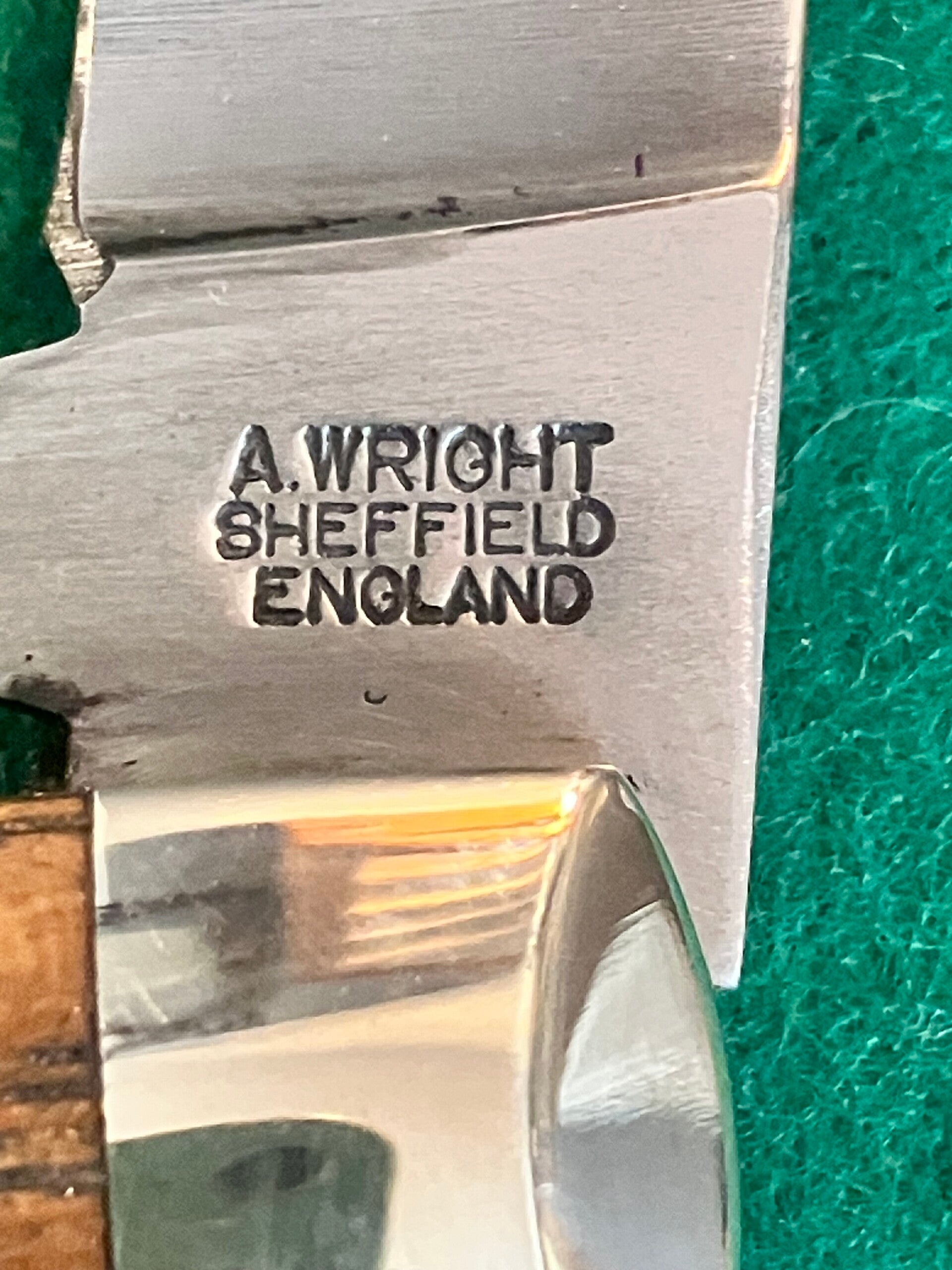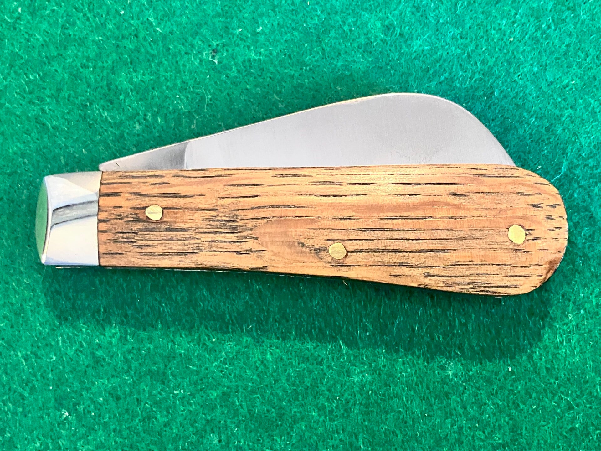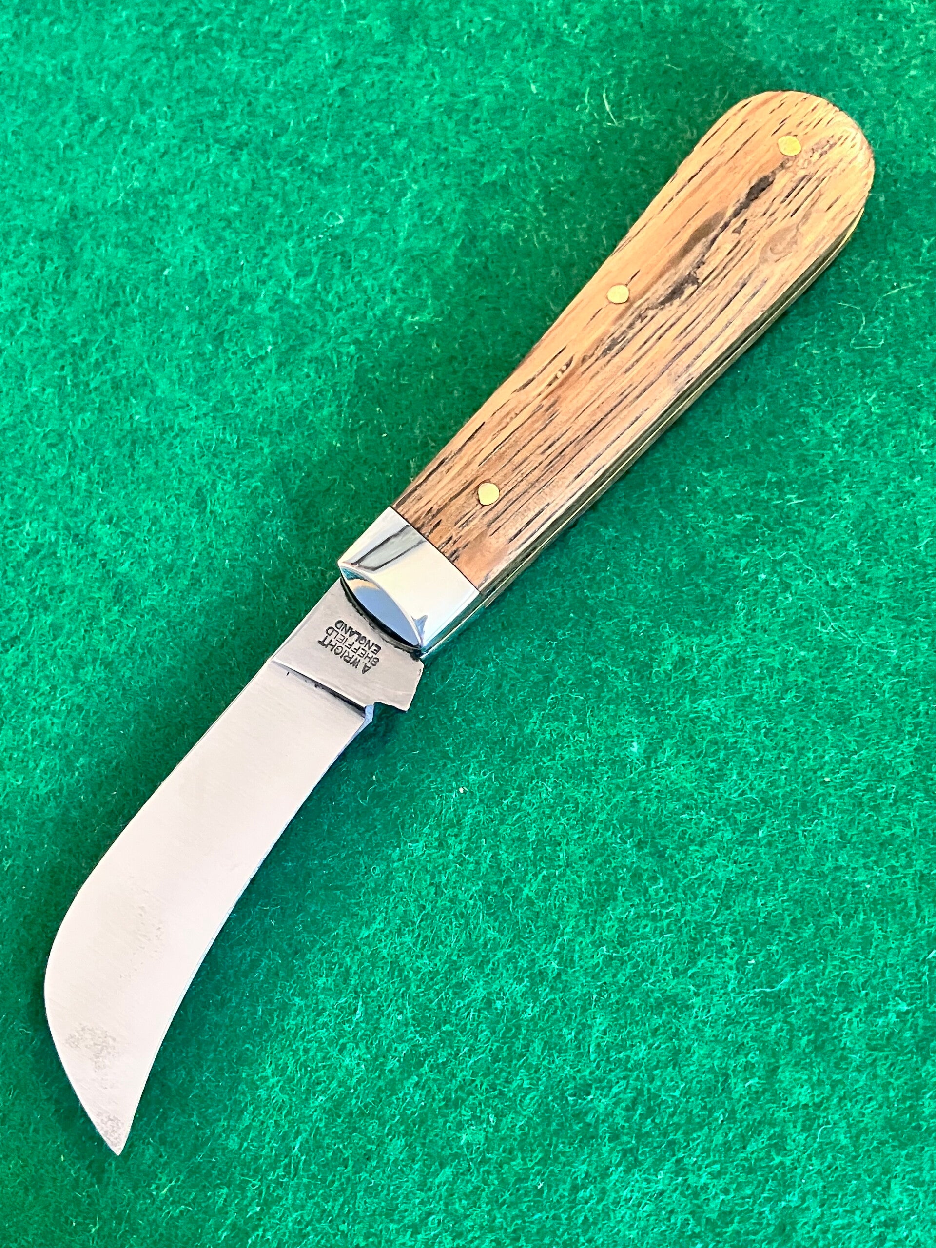 In unused condition but has some light surface patination from storage. Whiskey oak barrel scales. Very strong snap & no play. Blade length approx 72mm. PHOTO ID REQUIRED BEFORE POSTING