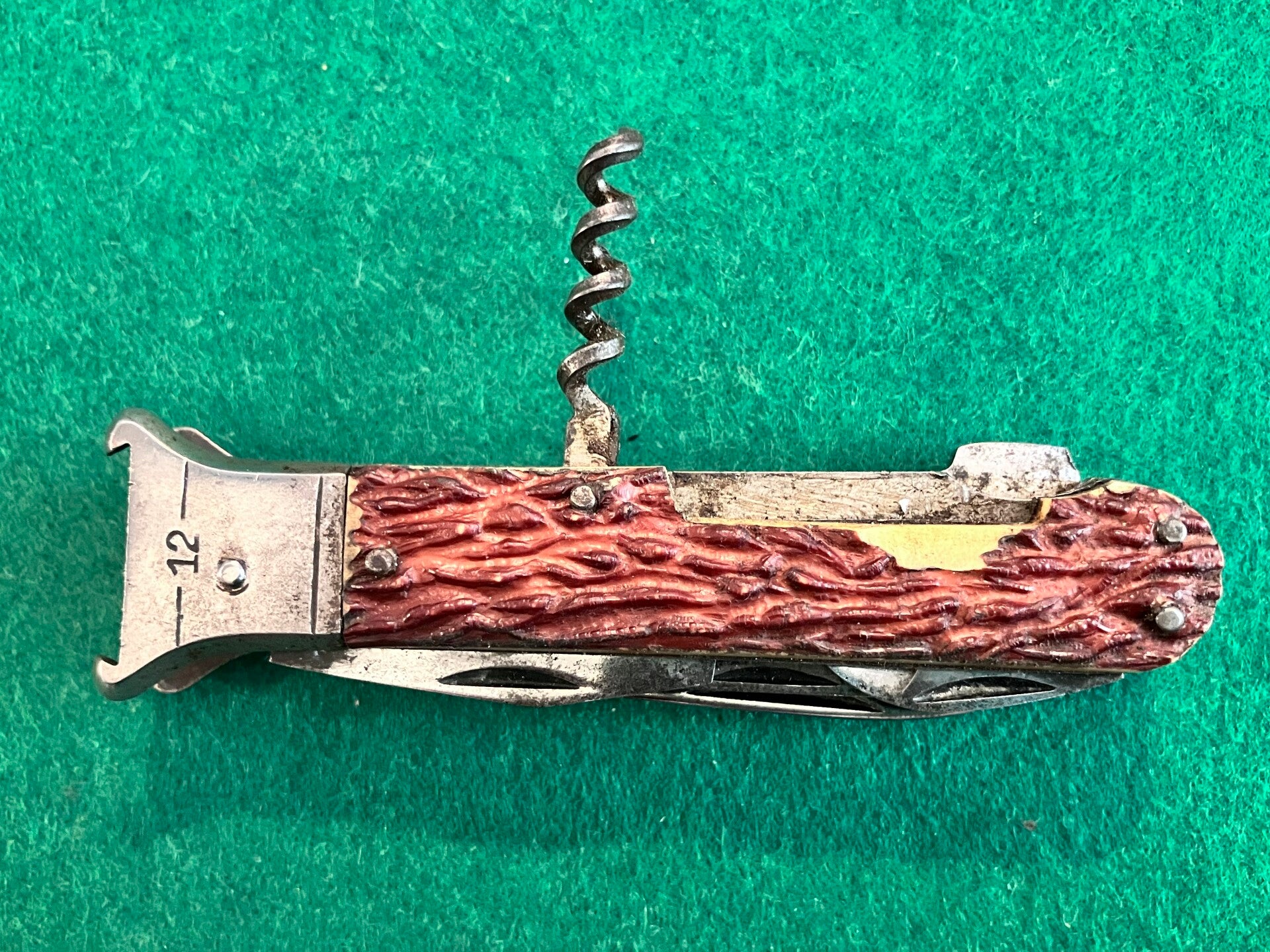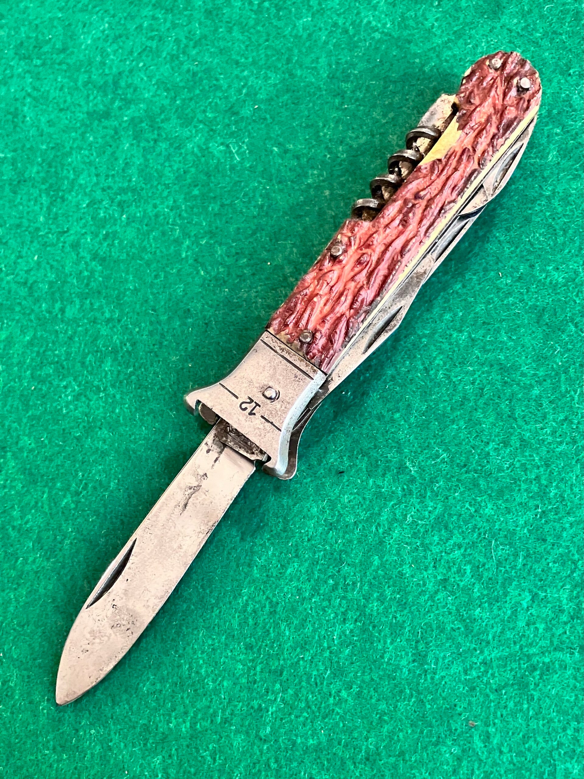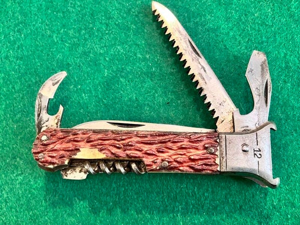 Locking sporting knife by Czech manufacturer Mikov. All tools have good snap & no play. Main blade locks securely. Scales are imitation stag. Main blade length approx 78mm. PHOTO ID REQUIRED BEFORE POSTING